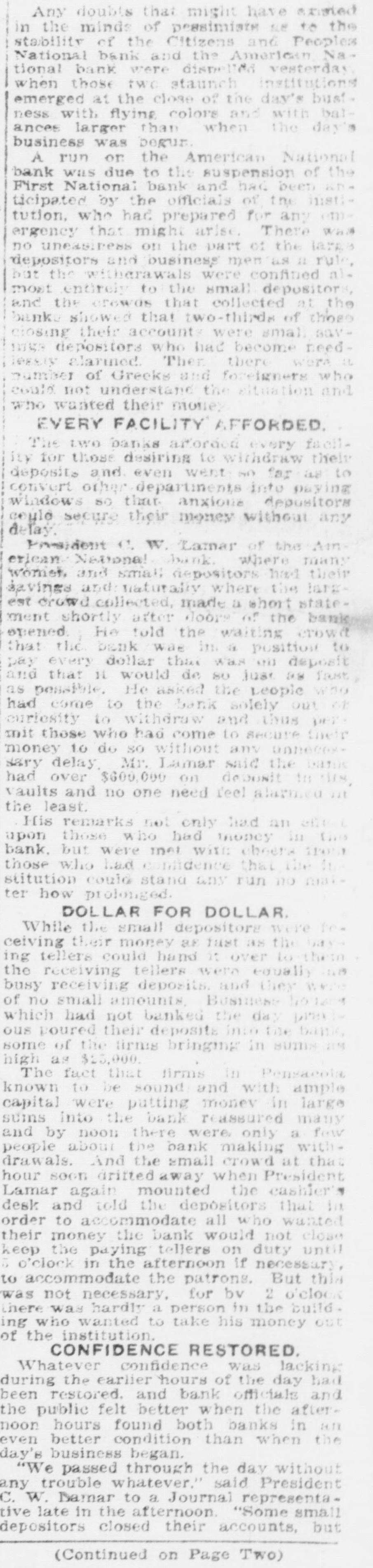 Any doubts that might have existed in the minds of pessimiste SE to the stability of the Citizens and Peoplex National bank and the American National bank were dispended vesterday when those two staunch institutions emerged at the close of the day's bust ness with flying colors and with balances larger than when the day business was begur. A run or the American National bank WILS due to the suspension of the First National bank and had been anticipated by the officials of the mist:tution. who had prepared for any emergency that might arise. There white no uneasiress on the part of the large depositors and business men as a rule but the withgrawals were confined almost entirely to the small depositor and the crewas that collected at the banks showed that two-thirds of choes closing their account were small savdepositors who had become needlessly alarmed Ther there were it number of Greeks and foreigners who equid not understand the situation and who wanted their more EVERY FACILITY AFFORDED The two banks afforded every facility for those desirins to withdraw their deposits and even went NO far as to convert other departments into paying windows so that anxione depositors could secure their money without any delay. President C. W. Lamar of the Am erican National bank where many women and small depositors have their savings and Naturally where the larzest drowd collected, made is short statement shortly after doors of the banis opened He told the waiting crown that the bank wae in a position to pay every dollar than was ail deposit and that 11 would de 80 just 98 last as possible. He asked the people who had come to the bank solely out of curiosity to withdraw and thus mit those who had come to secure their money 1.0 do so without any unnecess sary delay. Mr. Lamar said the had over $600,000 on decosit in 118 vaults and no one need reel alarmed set the least. His remarks not only had an aft upon those who had money iss this bank. but were met with obsers 1POLT those who had indicence that the 11 stitution could stand any run no main ter how prolonged DOLLAR FOR DOLLAR While the small depositors were feDay ceiving their money as fast as the ing tellers could hand it over to that 1119 the receiving tellers were equally busy receiving deposits. and they 1:4 is of no small amounts Business no is which had not banked the da: ous poured their deposits into the bank some of the firms bringing in BUTTE as high as $25,000. The fact that firms in Pensacola known to be sound and with ample capital were putting money in large sums into the bank reassured many and by noon there were only a few people about the bank making withdrawals. And the small crowd at that hour soon dritted away when President Lamar again mounted the cashier , desk and told the depositors that in order to accommodate all who wanted their money the bank would not close keep the paying tellers on duty until = o'clock in the afternoon if necessary to accommodate the patrons. But this was not necessary. for bv 2 o'cloc there was hardly a person in the build. ing who wanted to take his money OUT of the institution. CONFIDENCE RESTORED. Whatever confidence was lacking during the earlier hours of the day had been restored. and bank officials and the public felt better when the afternoon hours found both banks in an even better condition than when the day's business began. "We passed through the day without any trouble whatever." said President C. W. Damar to a Journal representa tive late in the afternoon "Some small depositors closed their accounts, but (Continued on Page Two)