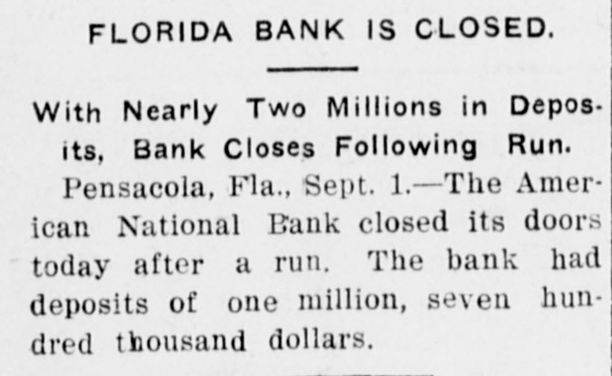 BANK CLOSES DOORS. Run of Depositors Overwhelms Pensacola, Fla., Institution. PENSACOLA, Fla., September 1.-The American National Bank of Pensacola closed its doors today after a run lasting about an hour. Aroused by sensational reports circulated last night depositors flocked to the bank this morning. For some time after the doors were closed streets in front of the bank's tenstory building were crowded. Officials of the bank have made no statement.