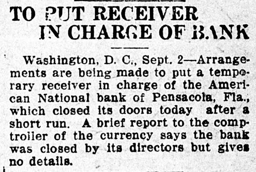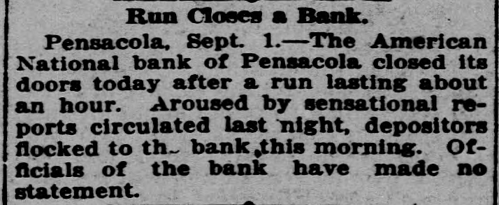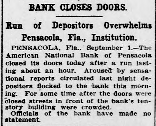BANK FAILURE. (BY ASSOCIATED PRESS) PENSACOLA, Fla., Sept. 2-The American National Bank of Pensacol has closed its doors after a run lasting about an hour. Aroused by sensational reports circulated last night depositors flocked to the bank this morning.