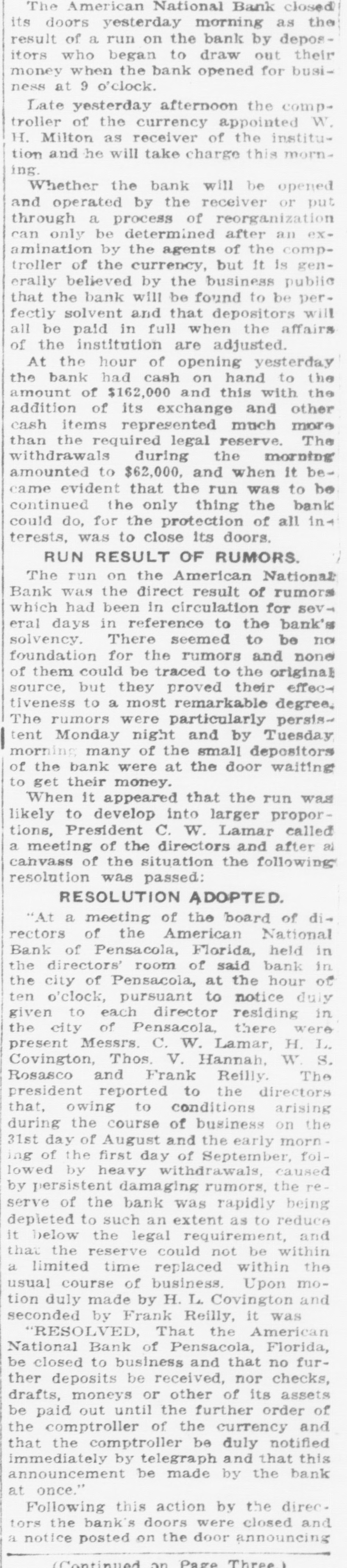 The American National Bank closed its doors yesterday morning as the result of a run on the bank by depositors who began to draw out their money when the bank opened for business at 9 0° 'clock. Late yesterday afternoon the comptroller of the currency appointed W. H. Milton as receiver of the institution and he will take charge this morning. Whether the bank will be opened and operated by the receiver or put through a process of reorganization can only be determined after an examination by the agents of the comptroller of the currency, but it is generally believed by the business public that the bank will be found to be perfectly solvent and that depositors will all be paid in full when the affairs of the institution are adjusted. At the hour of opening yesterday the bank had cash on hand to the amount of $162,000 and this with the addition of its exchange and other cash items represented much more than the required legal reserve. The withdrawals during the morning amounted to $62,000, and when it became evident that the run was to be continued the only thing the bank could do, for the protection of all interests, was to close its doors. RUN RESULT OF RUMORS. The run on the American National Bank was the direct result of rumors which had been in circulation for Several days in reference to the bank's solvency. There seemed to be no foundation for the rumors and none of them could be traced to the original source, but they proved their effect tiveness to a most remarkable degree. The rumors were particularly persistent Monday night and by Tuesday morning many of the small depositors of the bank were at the door waiting to get their money. When it appeared that the run was likely to develop into larger proportions, President C. W. Lamar called a meeting of the directors and after at canvass of the situation the following resolution was passed: RESOLUTION ADOPTED. "At a meeting of the board of directors of the American National Bank of Pensacola, Florida, held in the directors' room of said bank in the city of Pensacola, at the hour of ten o'clock, pursuant to notice duly given to each director residing in the city of Pensacola, there were present Messrs. C. W. Lamar, H. L. Covington, Thos. V. Hannah, W. S. Rosasco and Frank Reilly. The president reported to the directors that, owing to conditions arising during the course of business on the 31st day of August and the early morning of the first day of September, followed by heavy withdrawals, caused by persistent damaging rumors, the reserve of the bank was rapidly being depleted to such an extent as to reduce it below the legal requirement, and that the reserve could not be within a limited time replaced within the usual course of business. Upon motion duly made by H. L. Covington and seconded by Frank Reilly, it was "RESOLVED, That the American National Bank of Pensacola, Florida, be closed to business and that no further deposits be received, nor checks, drafts, moneys or other of its assets be paid out until the further order of the comptroller of the currency and that the comptroller be duly notified immediately by telegraph and that this announcement be made by the bank at once.' Following this action by the direc. tors the bank's doors were closed and a notice posted on the door announcing (Continued an Page Three)