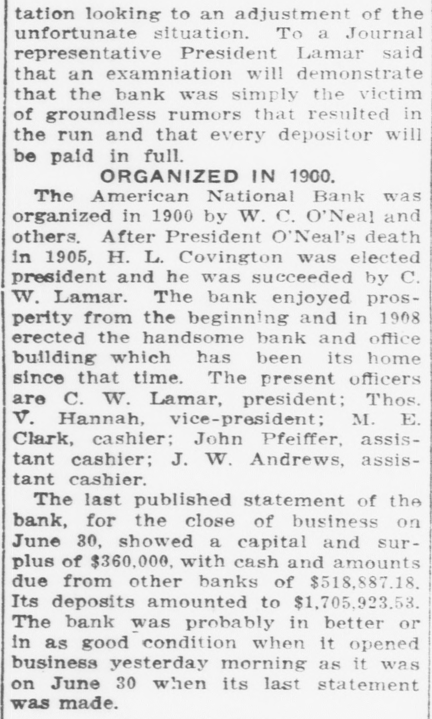 tation looking to an adjustment of the unfortunate situation. To a Journal representative President Lamar said that an examniation will demonstrate that the bank was simply the victim of groundless rumors that resulted in the run and that every depositor will be paid in full. ORGANIZED IN 1900. The American National Bank was organized in 1900 by W. C. O'Neal and others. After President O'Neal's death in 1905, H. L. Covington was elected president and he was succeeded by C. W. Lamar. The bank enjoyed prosperity from the beginning and in 1908 erected the handsome bank and office building which has been its home since that time. The present officers are C. W. Lamar, president; Thos. V. Hannah, vice-president; M. E. Clark, cashier; John Pfeiffer, assistant cashier; J. W. Andrews, assistant cashier. The last published statement of the bank, for the close of business on June 30, showed a capital and surplus of $360,000, with cash and amounts due from other banks of $518,887.18. Its deposits amounted to $1,705,923.53. The bank was probably in better or in as good condition when it opened business yesterday morning as it was on June 30 when its last statement was made.