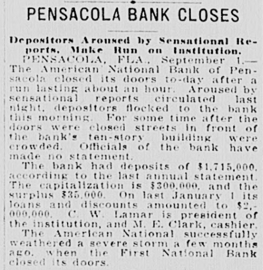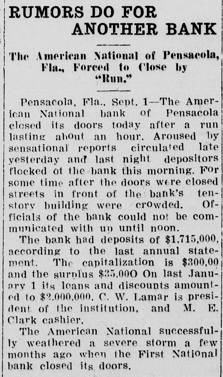 RUMORS DO FOR ANOTHER BANK The American National of Pensacola, Fla., Forced to Close by "Run." Pensacola, Fla., Sept. 1-The American National bank of Pensacola closed its doors today after a run lasting about an hour. Aroused by sensational reports circulated late yesterday and last night depositors flocked ot the bank this morning. For some time after the doors were closed streets in front of the bank's tenstory building were crowded. Officials of the bank could not be communicated with un until noon. The bank had deposits of $1,715,000, according to the last annual statement. The capitalization is $300,00 and the surplus $35,000 On last January 1 its loans and discounts amounted to $2.000.000, C. W. Lamar is president of the institution, and M. E. Clark cashier. The American National successfully weathered a severe storm a few months ago when the First National bank closed its doors.