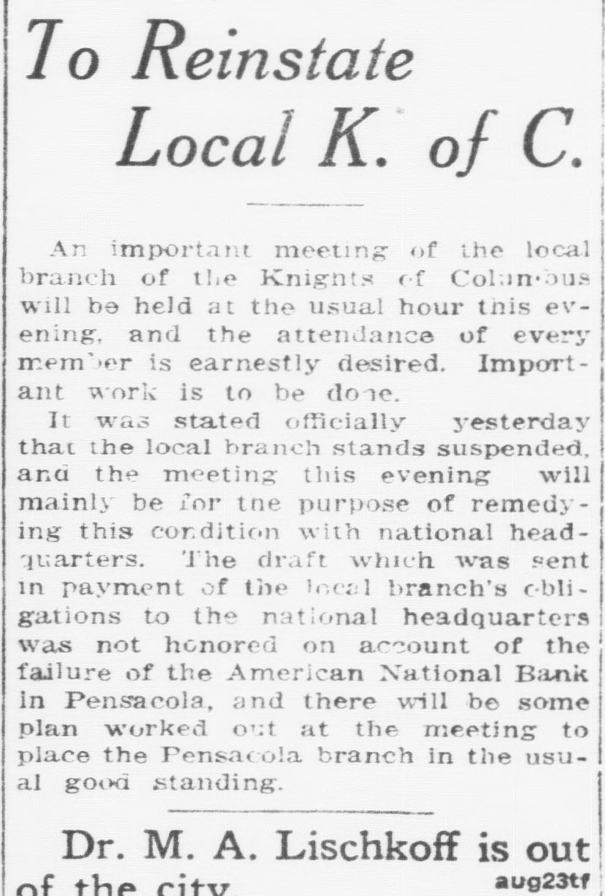 To Reinstate Local K. of C. An important meeting of the local branch of the Knights of Columbus will be held at the usual hour this evening, and the attendance of every member is earnestly desired. Important work is to be done. It was stated officially yesterday that the local branch stands suspended, and the meeting this evening will mainly be for the purpose of remedying this condition with national headquarters. The draft which was sent in payment of the local branch's c-bligations to the national headquarters was not honored on account of the failure of the American National Bank in Pensacola, and there will be some plan worked out at the meeting to place the Pensacola branch in the usual good standing. Dr. M. A. Lischkoff is out aug23tf of the city