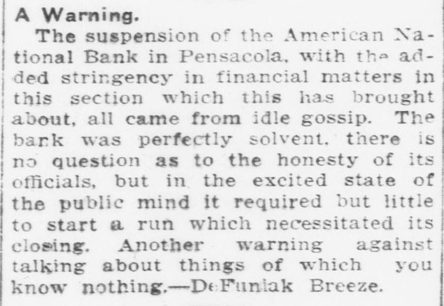 A Warning. The suspension of the American National Bank in Pensacola, with the added stringency in financial matters in this section which this has brought about, all came from idle gossip. The bank was perfectly solvent. there is no question as to the honesty of its officials, but in the excited state of the public mind it required but little to start a run which necessitated its closing. Another warning against talking about things of which you know nothing.-DeFuniak Breeze.