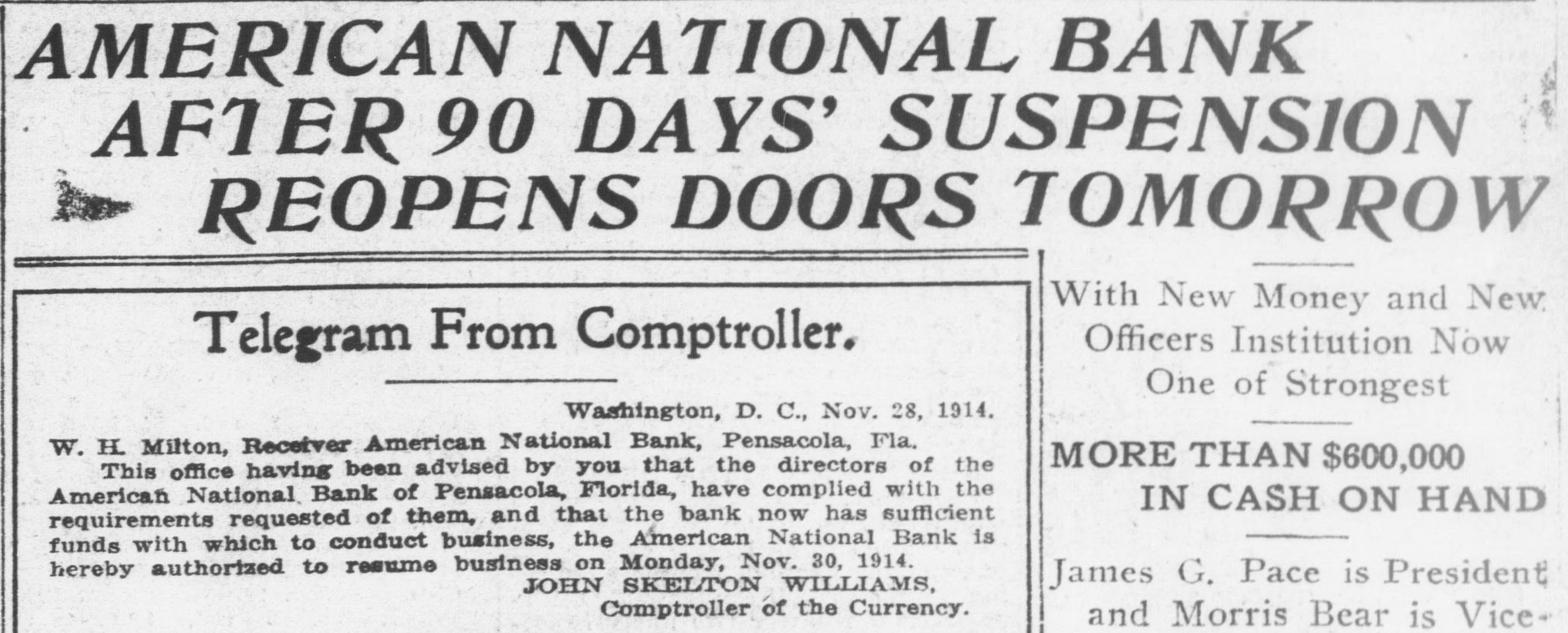 AMERICAN NATIONAL BANK AFTER 90 DAYS' SUSPENSION REOPENS DOORS TOMORROW With New Money and New Officers Institution Now Telegram From Comptroller. One of Strongest Washington, D. C., Nov. 28, 1914. W. H. Milton, Receiver American National Bank, Pensacola, Fla. MORE THAN $600,000 This office having been advised by you that the directors of the American National Bank of Pensacola, Florida, have complied with the IN CASH ON HAND requirements requested of them, and that the bank now has sufficient funds with which to conduct business, the American National Bank is hereby authorized to resume business on Monday, Nov. 30, 1914. James G. Pace is President JOHN SKELTON WILLIAMS, Comptroller of the Currency. and Morris Bear is Vice-