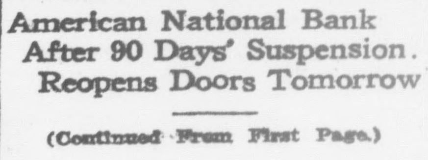 American National Bank After 90 Days' Suspension Reopens Doors Tomorrow (Continued From First Page.)