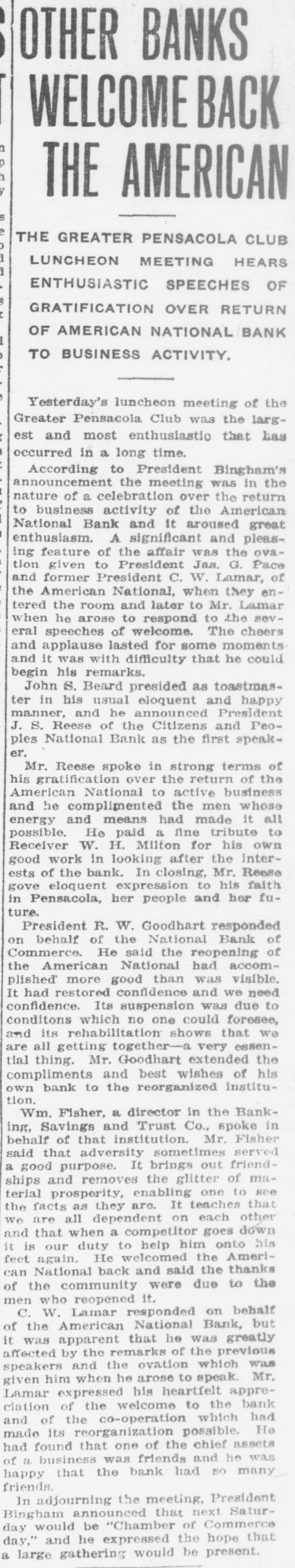 OTHER BANKS WELCOME BACK THE AMERICAN THE GREATER PENSACOLA CLUB LUNCHEON MEETING HEARS ENTHUSIASTIC SPEECHES OF GRATIFICATION OVER RETURN OF AMERICAN NATIONAL BANK TO BUSINESS ACTIVITY. Yesterday's luncheon meeting of the Greater Pensacola Club was the largest and most enthusiastic that has occurred in a long time. According to President Bingham's announcement the meeting was in the nature of a celebration over the return to business activity of the American National Bank and it aroused great enthusiasm. A significant and pleasing feature of the affair was the ovation given to President Jas. G. Pace and former President C. W. Lamar, of the American National, when they entered the room and later to Mr. Lamar when he arose to respond to the several speeches of welcome. The cheers and applause lasted for some moments and it was with difficulty that he could begin his remarks. John S. Beard presided as toastmaster in his usual eloquent and happy manner, and he announced President J. S. Reese of the Citizens and Peoples National Bank as the first speaker. Mr. Reese spoke in strong terms of his gratification over the return of the American National to active business and he complimented the men whose energy and means had made it all possible. He paid a fine tribute to Receiver W. H. Milton for his own good work in looking after the interests of the bank. In closing, Mr. Reese gove eloquent expression to his faith in Pensacola, her people and her future. President R. W. Goodhart responded on behalf of the National Bank of Commerce. He said the reopening of the American National had accomplished more good than was visible. It had restored confidence and we need confidence. Its suspension was due to conditons which no one could foresee, and its rehabilitation shows that we are all getting together-a very essential thing. Mr. Goodhart extended the compliments and best wishes of his own bank to the reorganized institution. Wm. Fisher, a director in the Banking, Savings and Trust Co., spoke in behalf of that institution. Mr. Fisher said that adversity sometimes served a good purpose. It brings out friendships and removes the glitter of material prosperity, enabling one to see the facts as they are. It teaches that We are all dependent on each other and that when a competitor goes down it is our duty to help him onto his feet again. He welcomed the American National back and said the thanks of the community were due to the men who reopened it. C. W. Lamar responded on behalf of the American National Bank, but it was apparent that he was greatly affected by the remarks of the previous speakers and the ovation which was given him when he arose to speak. Mr. Lamar expressed his heartfelt appreclation of the welcome to the bank and of the co-operation which had made its reorganization possible. He had found that one of the chief assets of a business was friends and he was happy that the bank had SO many friends. In adjourning the meeting, President Bingham announced that next Saturday would be "Chamber of Commerce day," and he expressed the hope that a large gathering would be present.