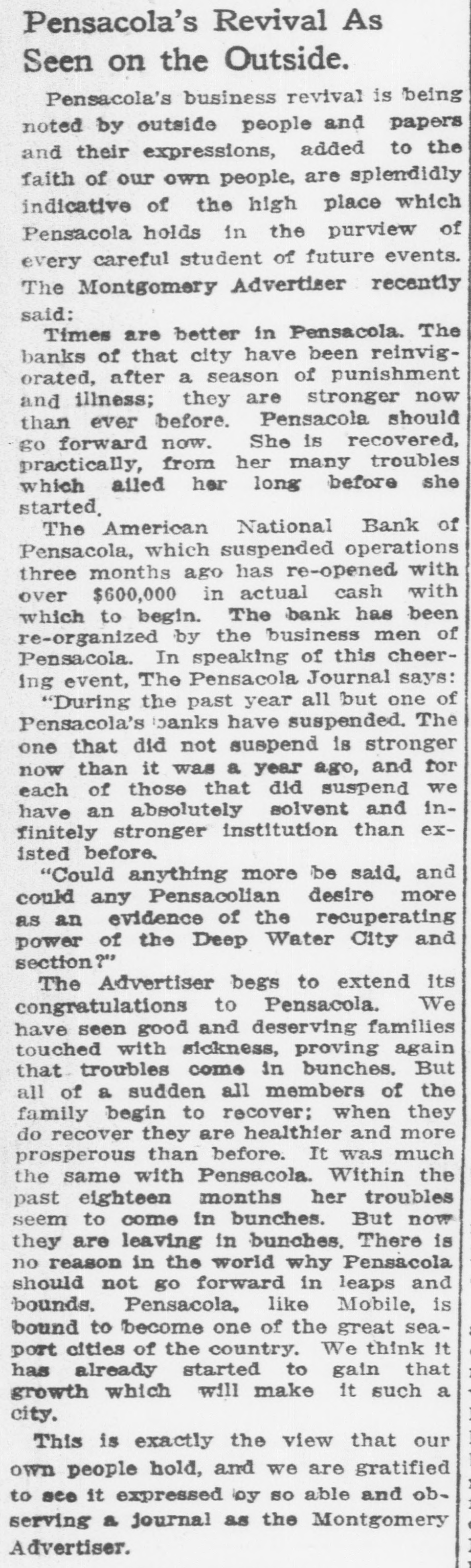 Pensacola's Revival As Seen on the Outside. Pensacola's business revival is being noted by outside people and papers and their expressions, added to the faith of our own people, are splendidly indicative of the high place which Pensacola holds in the purview of every careful student of future events. The Montgomery Advertiser recently said: Times are better in Pensacola. The banks of that city have been reinvigorated, after a season of punishment and illness; they are stronger now than ever before. Pensacola should go forward now. She is recovered, practically, from her many troubles which ailed her long before she started. The American National Bank of Pensacola, which suspended operations three months ago has re-opened with over $600,000 in actual cash with which to begin. The bank has been re-organized by the business men of Pensacola. In speaking of this cheering event, The Pensacola Journal says: "During the past year all but one of Pensacola's banks have suspended. The one that did not suspend is stronger now than it was a year ago, and for each of those that did suspend we have an absolutely solvent and infinitely stronger institution than exlisted before. "Could anything more be said, and could any Pensacolian desire more as an evidence of the recuperating power of the Deep Water City and section?" The Advertiser begs to extend its congratulations to Pensacola. We have seen good and deserving families touched with sickness, proving again that troubles come in bunches. But all of a sudden all members of the family begin to recover; when they do recover they are healthier and more prosperous than before. It was much the same with Pensacola. Within the past eighteen months her troubles seem to come in bunches. But now they are leaving in bunches. There is no reason in the world why Pensacola should not go forward in leaps and bounds. Pensacola, like Mobile, is bound to become one of the great seaport cities of the country. We think it has already started to gain that growth which will make it such a city. This is exactly the view that our own people hold, and we are gratified to see it expressed by so able and observing a journal as the Montgomery Advertiser.