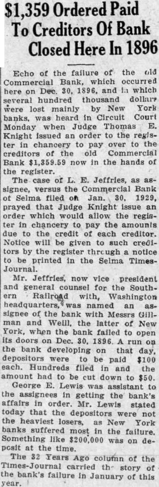 Ordered Paid To Creditors Of Bank Closed Here In 1896 Echo of the failure of the old Commercial Bank, which occurred Dec. 30, 1896, and la which here on several hundred thousand dollars were lost mainly by New York banks, was heard in Circuit Court Monday when Judge Thomas Knight Issued an order the register in to over to the pay creditors of Commercial Bank $1,359.59 now in the hands the register. The of E. Jeffries, asthe Bank filed 1929, prayed Judge Knight order which would allow the register pay the amounts due the of creditor. Notice will to creditors by the notice to printed in the Selma TimesMr. Jeffries, now vice president and general counsel for the SouthRailroad with, Washington named signee the bank with Messrs GillWelll, the latter of New York, when the bank failed to open its doors Dec. 30, run the bank developing that day, were be paid $100 each. Hundreds filed the amount cut down $50. George E. Lewis assistant the assignees getting the bank's affairs Mr. Lewis stated today that were not the York banks most the failure. like $200,000 was on deposit the The 32 column of the the bank's failure in January of this year.