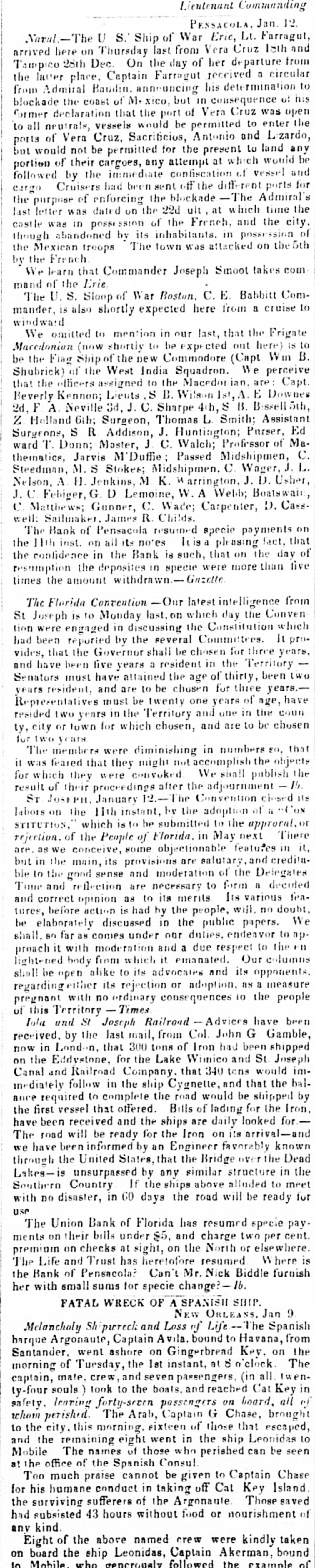 Lieutenant Commanding PESSACOLA, Jan. 12. Naval. The U S. Ship of War Eric, Lt. Farragut, arrived here on Thursday last from Vera Cruz 18th and Tampico 28th Dec. On the day of her departure from the laver place, Captain Farragut received a circular from Admiral Baudin, announcing his determination to blockade the coast of Mexico, but in consequence of his former declaration that the port of Vera Cruz was open to all neutrals, vessels would be permitted to enter the ports of Vera Cruz, Sacrificios, Antonio and Lizardo, but would not be permitted for the present to land any portion of their cargoes, any attempt at which would be followed by the immediate confiscation of vessel and cargo. Cruisers had been sent off the different ports for the purpose of enforcing the blockade -The Admiral's last letter was dated on the 22d ult, at which time the castle was in possession of the French, and the city, though abandoned by its inhabitants, in possession of the Mexican troops. The town was attacked on the 5th by the French. We learn that Commander Joseph Smoot takes command of the Erie. The U. S. Sloop of War Boston, C. E. Babbitt Commander, is also shortly expected here from a cruise to windward We omitted to mention in our last, that the Frigate Macedonian (now shortly to be expected out here) is to be the Flag Ship of the new Commodore (Capt Wm B. Shubrick) of the West India Squadron. We perceive that the officers assigned to the Macedonian, are: Capt. Beverly Kennon; Lieuts, S B. Wilson Ist, A. E Downes 2d, F. A. Neville 3d, J. C. Sharpe 4th, S B. Bissell 5th, Z. Holland 6th; Surgeon, Thomas L. Smith; Assistant Surgeons, S R Addison, J. Huntington; Purser, Ed ward T. Dann; Master, J. C. Walch; Professor of Mathematics, Jarvis M'Duffie; Passed Midshipmen, C. Steedman, M. S. Stokes; Midshipmen, C. Wager, J. L. Nelson, A. H. Jenkins, M. K. Warrington, J. D. Usher, J. C. Febiger, G. D. Lemoine, W. A Webb; Boatswain, C. Matthews; Gunner, C. Wade; Carpenter, D. Cass-weil: Sailmaker, James R. Childs. The Bank of Pensacola resumed specie payments on the 11th inst. on all its notes It is a pleasing fact, that the confidence in the Bank is such, that on the day of resumption the deposites in specie were more than five times the amount withdrawn. Gazette. The Florida Convention - Our latest intelligence from St Joseph is to Monday last, on which day the Convention were engaged in discussing the Constitution which had been reported by the several Committees. It provides, that the Governor shall be chosen for three years, and have been five years a resident in the Territory Senators must have attained the age of thirty, been two years resident, and are to be chosen for three years. Representatives must be twenty one years of age, have resided two years in the Territory and one in the county, city or town for which chosen, and are to be chosen for two years. The members were diminishing in numbers so, that it was feared that they might not accomplish the objects for which they were convoked. We shall publish the result of their proceedings after the adjournment-b. ST. JOSEPH, January 12.-The Convention closed its labors on the 11th instant, by the adoption of a "CONSTITUTION," which is to be submitted to the approral, or rejection, of the People of Florida, in May next There are. as we conceive, some objectionable features in it, but in the main, its provisions are salutary, and creditable to the good sense and moderation of the Delegates. Time and reflection are necessary to form a decided and correct opinion as to its merits. Its various features, before action is had by the people, will, no doubt, be elaborately discussed in the public papers. We shall, so far as comes under our duties, endeavor to approach it with moderation and a due respect to the enlightened body from which it emanated. Our columns shall be open alike to its advocates and its opponents. regarding either its rejection or adoption, as a measure pregnant with no ordinary consequences to the people of this Territory - Times. Iola and St Joseph Railroad Advices have been received, by the last mail, from Col. John G Gamble, now in London, that 300 tons of Iron had been shipped on the Eddystone, for the Lake Wimico and St. Joseph Canal and Railroad Company, that 340 tons would immediately follow in the ship Cygnette, and that the balance required to complete the road would be shipped by the first vessel that offered. Bills of lading for the Iron, have been received and the ships are daily looked for. The road will be ready for the Iron on its arrival-and we have been informed by an Engineer favorably known through the United States, that the Bridge over the Dead Lakes-is unsurpassed by any similar structure in the Southern Country If the ships above alluded to meet with no disaster, in 60 days the road will be ready for use The Union Bank of Florida has resumed specie payments on their bills under $5, and charge two per cent. premium on checks at sight, on the North or elsewhere. The Life and Trust has heretofore resumed. Where is the Bank of Pensacola? Can't Mr. Nick Biddle furnish her with small sums for specie change?-16. # FATAL WRECK OF A SPANISH SHIP. NEW ORLEANS, Jan 9. Melancholy Shipwreck and Loss of Life--The Spanish barque Argonaute, Captain Avila, bound to Havana, from Santander, went ashore on Gingerbread Key, on the morning of Tuesday, the 1st instant, at 8 o'clock. The captain, mate, crew, and seven passengers, (in all. twenty-four souls) took to the boats, and reached Cat Key in safety, leaving forty-seven passengers on board, all of whom perished. The Arab, Captain G Chase, brought to the city, this morning, sixteen of those that escaped, and the remaining eight went in the ship Leonidas to Mobile The names of those who perished can be seen at the office of the Spanish Consul. Too much praise cannot be given to Captain Chase for his humane conduct in taking off Cat Key Island. the surviving sufferers of the Argonaute. Thos