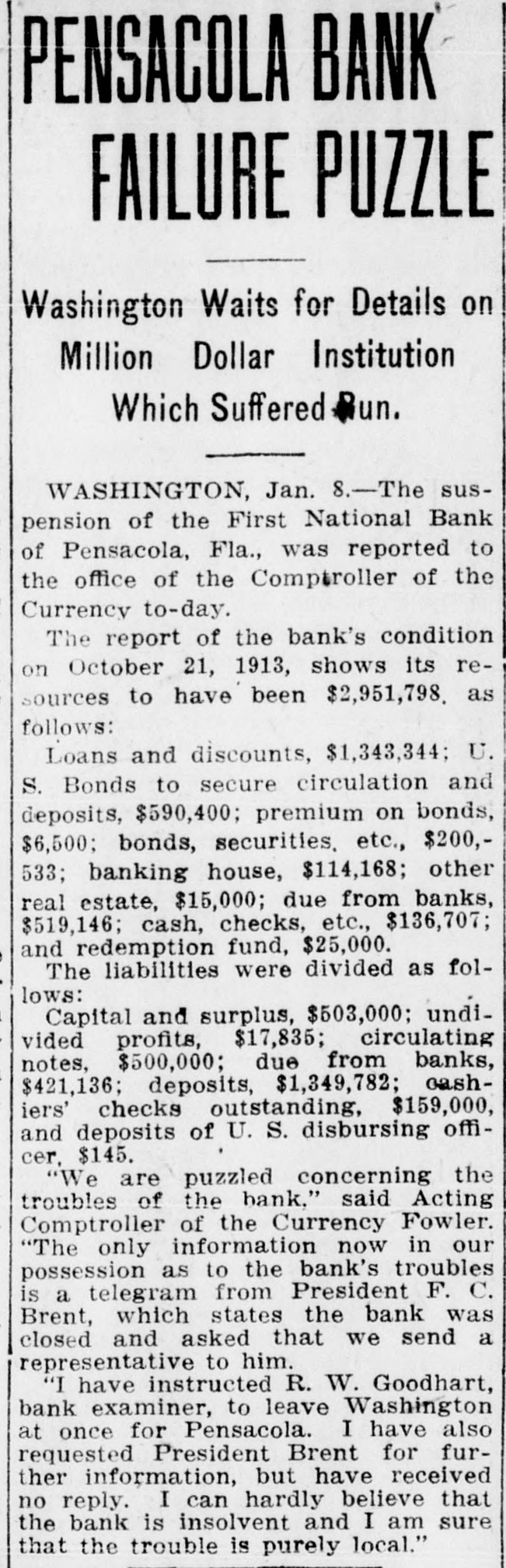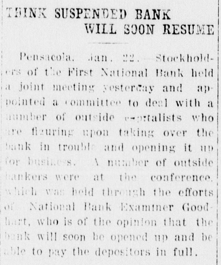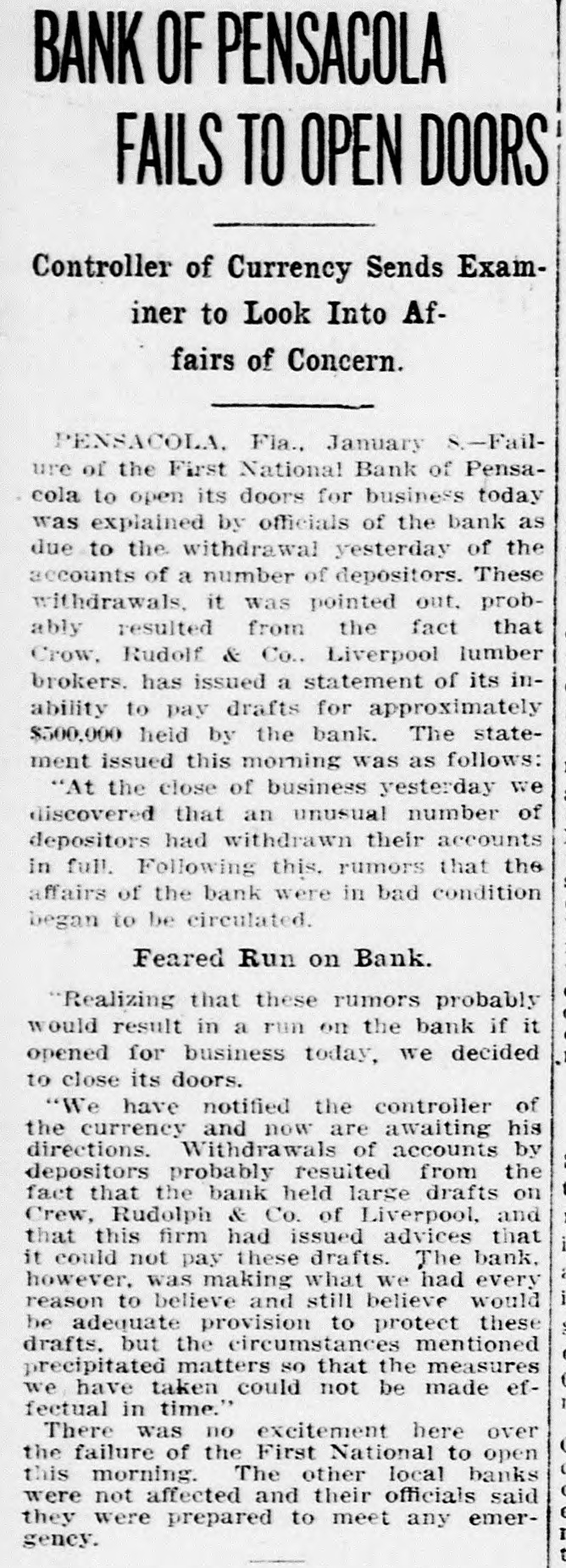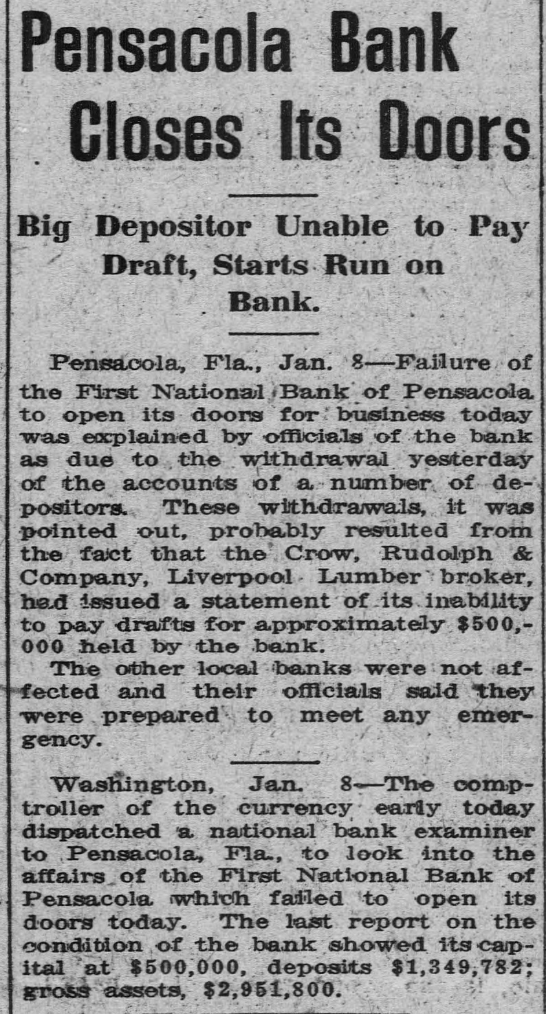 Pensacola Bank Closes Its Doors Big Depositor Unable to Pay Draft, Starts Run on Bank. Pensacola, Fla., Jan. 8-Failure of the First National Bank of Pensacola to open its doors for business today was explained by officials of the bank as due to the withdrawal yesterday of the accounts of a number of depositors. These withdrawals, it was pointed out, probably resulted from the fact that the Crow, Rudolph & Company, Liverpool Lumber broker, had issued a statement of its inability to pay drafts for approximately $500,000 held by the bank. The other local banks were not affected and their officials said they were prepared to meet any emergency. Washington, Jan. 8-The comptroller of the currency early today dispatched a national bank examiner to Pensacola, Fla., to look into the affairs of the First National Bank of Pensacola which failed to open its doors today. The last report on the condition of the bank showed its capital at $500,000, deposits $1,349,782; gross assets, $2,951,800.
