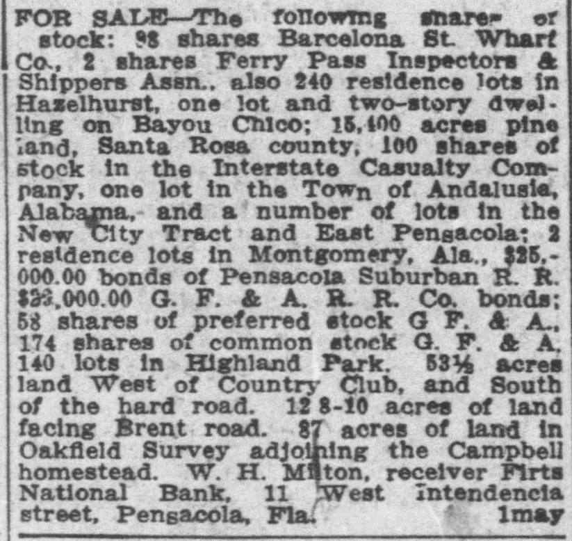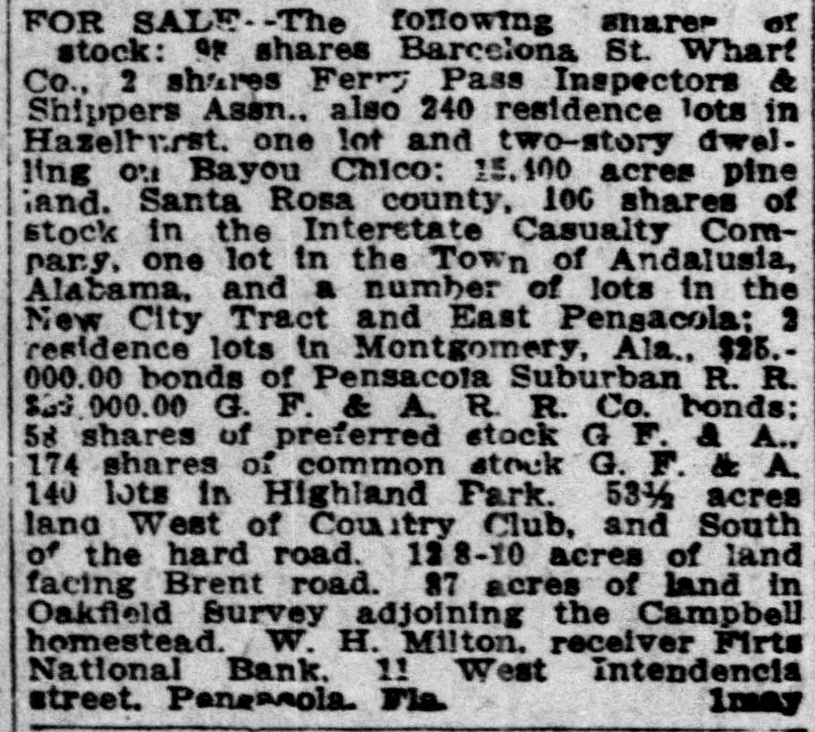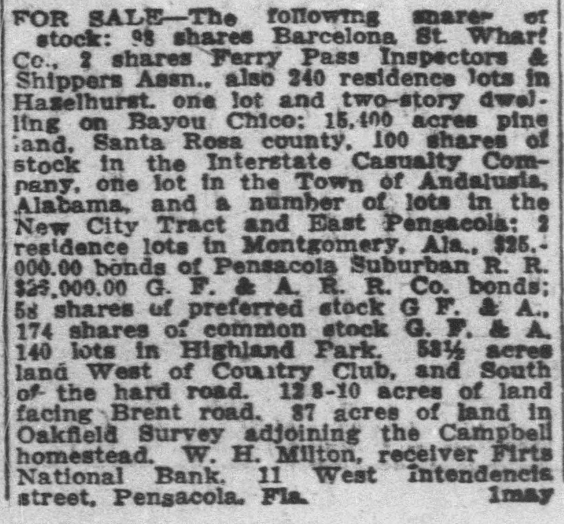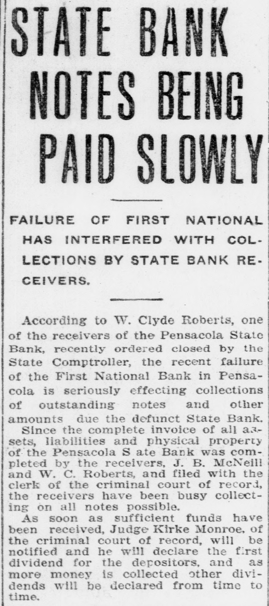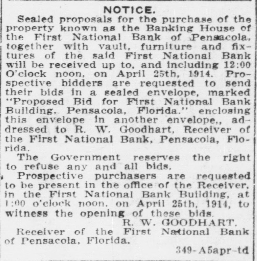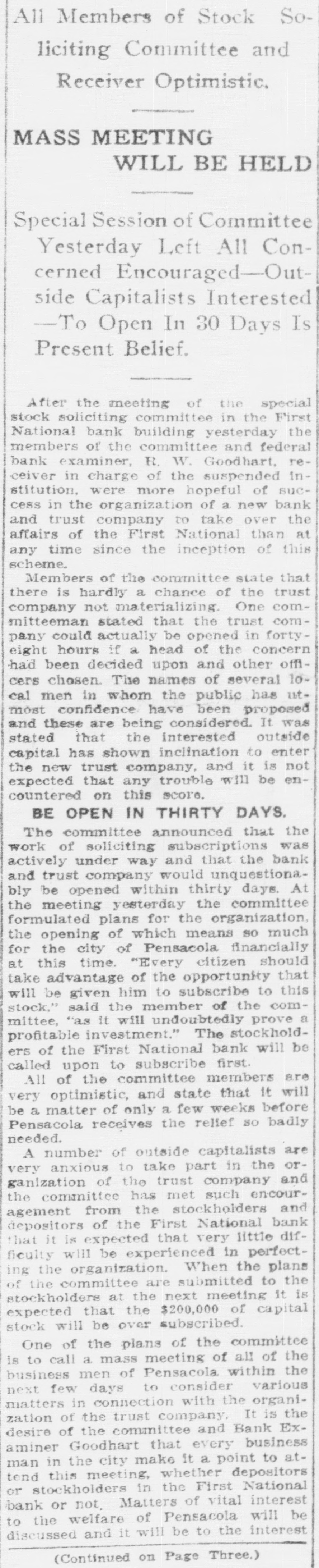 Pensacola Bank Closes Its Doors Big Depositor Unable to Pay Draft, Starts Run on Bank. Pensacola, Fla., Jan. 8-Failure of the First National Bank of Pensacola to open its doors for business today was explained by officials of the bank as due to the withdrawal yesterday of the accounts of a number of depositors. These withdrawals, it was pointed out, probably resulted from the fact that the Crow, Rudolph & Company, Liverpool Lumber broker, had issued a statement of its inability to pay drafts for approximately $500,000 held by the bank. The other local banks were not affected and their officials said they were prepared to meet any emergency. Washington, Jan. 8-The comptroller of the currency early today dispatched a national bank examiner to Pensacola, Fla., to look into the affairs of the First National Bank of Pensacola which failed to open its doors today. The last report on the condition of the bank showed its capital at $500,000, deposits $1,349,782; gross assets, $2,951,800.