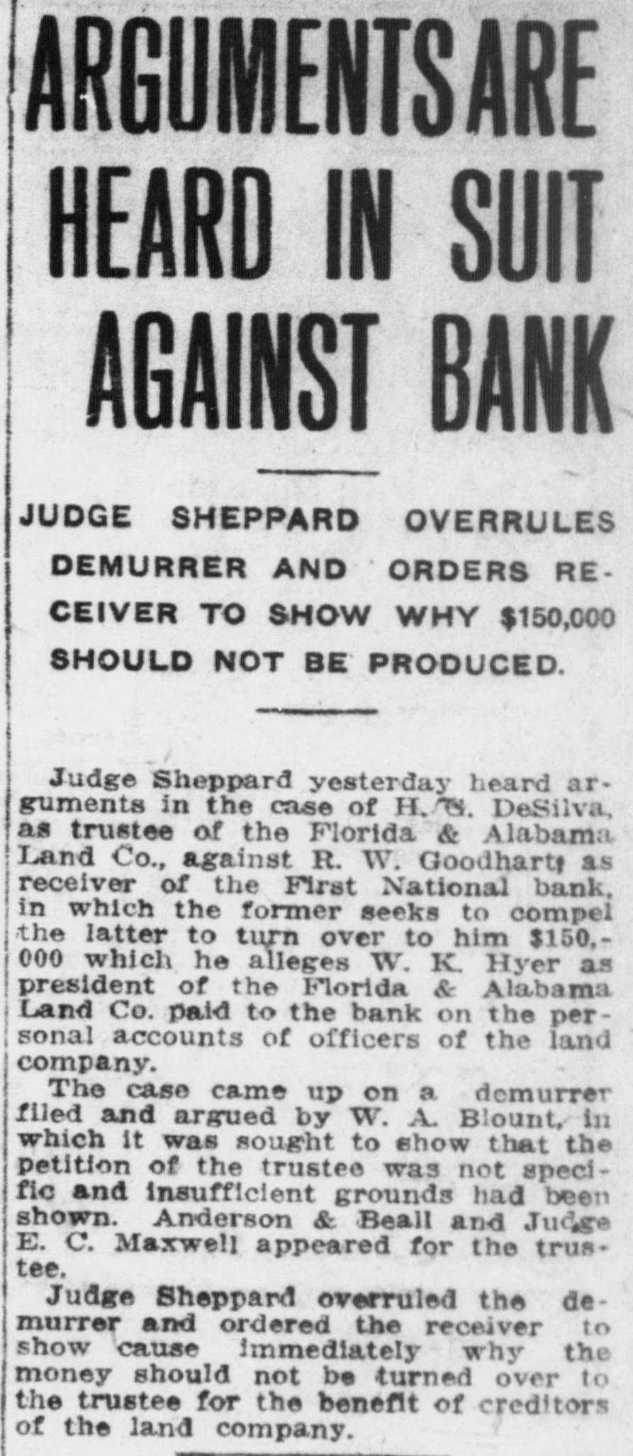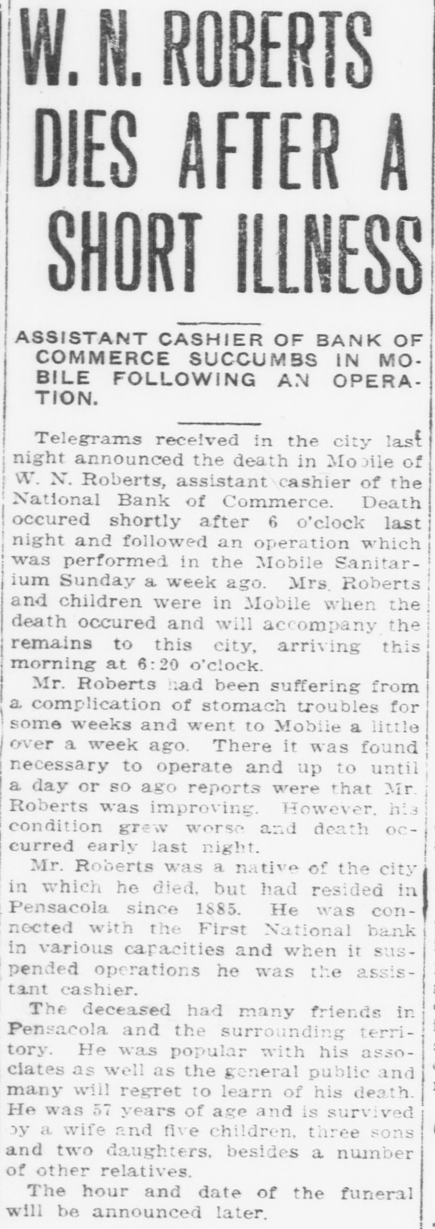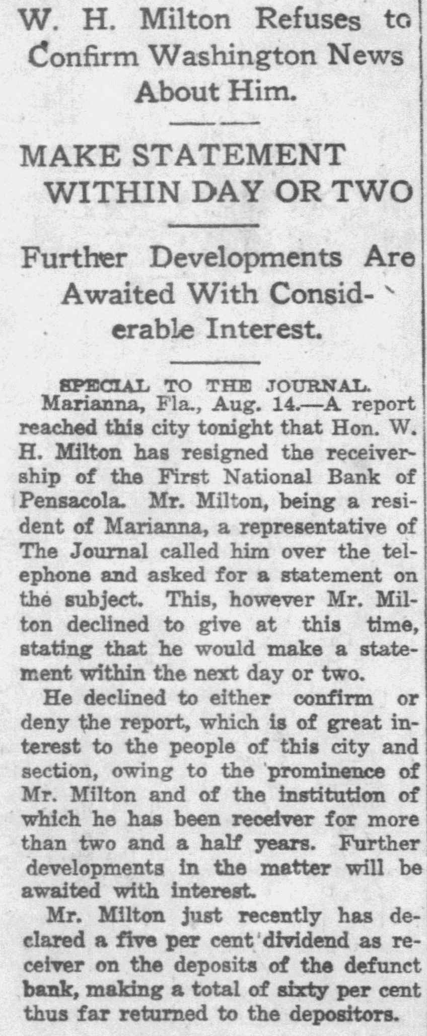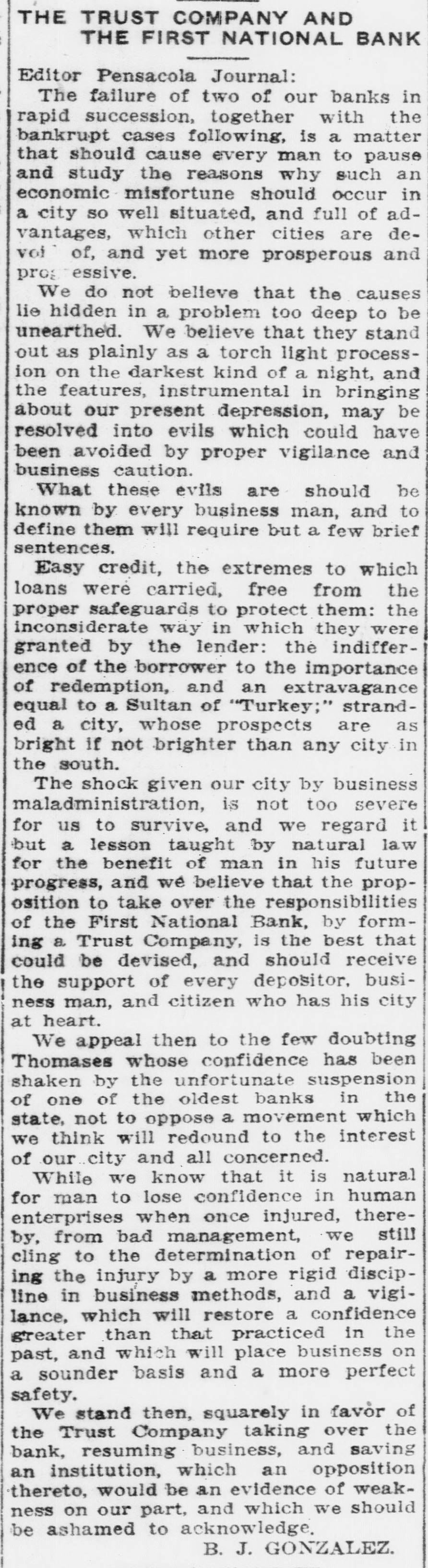 Pensacola Bank Closes Its Doors Big Depositor Unable to Pay Draft, Starts Run on Bank. Pensacola, Fla., Jan. 8-Failure of the First National Bank of Pensacola to open its doors for business today was explained by officials of the bank as due to the withdrawal yesterday of the accounts of a number of depositors. These withdrawals, it was pointed out, probably resulted from the fact that the Crow, Rudolph & Company, Liverpool Lumber broker, had issued a statement of its inability to pay drafts for approximately $500,000 held by the bank. The other local banks were not affected and their officials said they were prepared to meet any emergency. Washington, Jan. 8-The comptroller of the currency early today dispatched a national bank examiner to Pensacola, Fla., to look into the affairs of the First National Bank of Pensacola which failed to open its doors today. The last report on the condition of the bank showed its capital at $500,000, deposits $1,349,782; gross assets, $2,951,800.