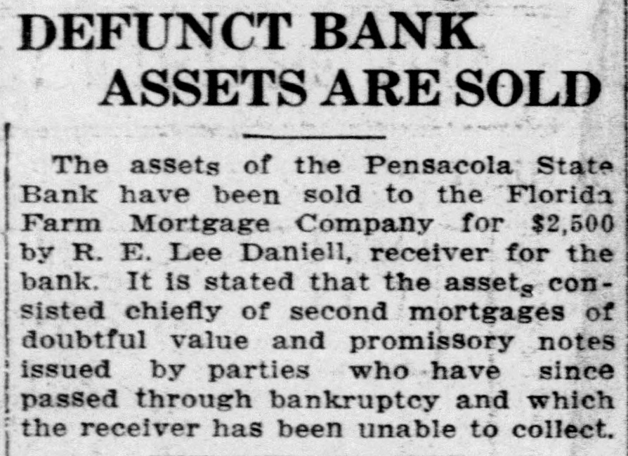 DEFUNCT BANK ASSETS ARE SOLD The assets of the Pensacola State Bank have been sold to the Florida Farm Mortgage Company for $2,500 by R. E. Lee Daniell, receiver for the bank. It is stated that the assets conSisted chiefly of second mortgages of doubtful value and promissory notes issued by parties who have since passed through bankruptcy and which the receiver has been unable to collect.