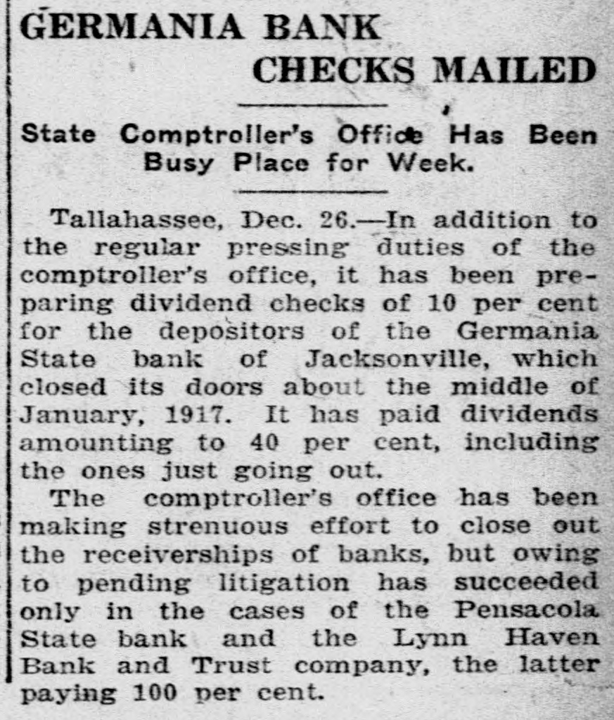 GERMANIA BANK CHECKS MAILED State Comptroller's Office Has Been Busy Place for Week. Tallahassee, Dec. 26.-In addition to the regular pressing duties of the comptroller's office, it has been preparing dividend checks of 10 per cent for the depositors of the Germania State bank of Jacksonville, which closed its doors about the middle of January, 1917. It has paid dividends amounting to 40 per cent, including the ones just going out. The comptroller's office has been making strenuous effort to close out the receiverships of banks, but owing to pending litigation has succeeded only in the cases of the Pensacola State bank and the Lynn Haven Bank and Trust company, the latter paying 100 per cent.