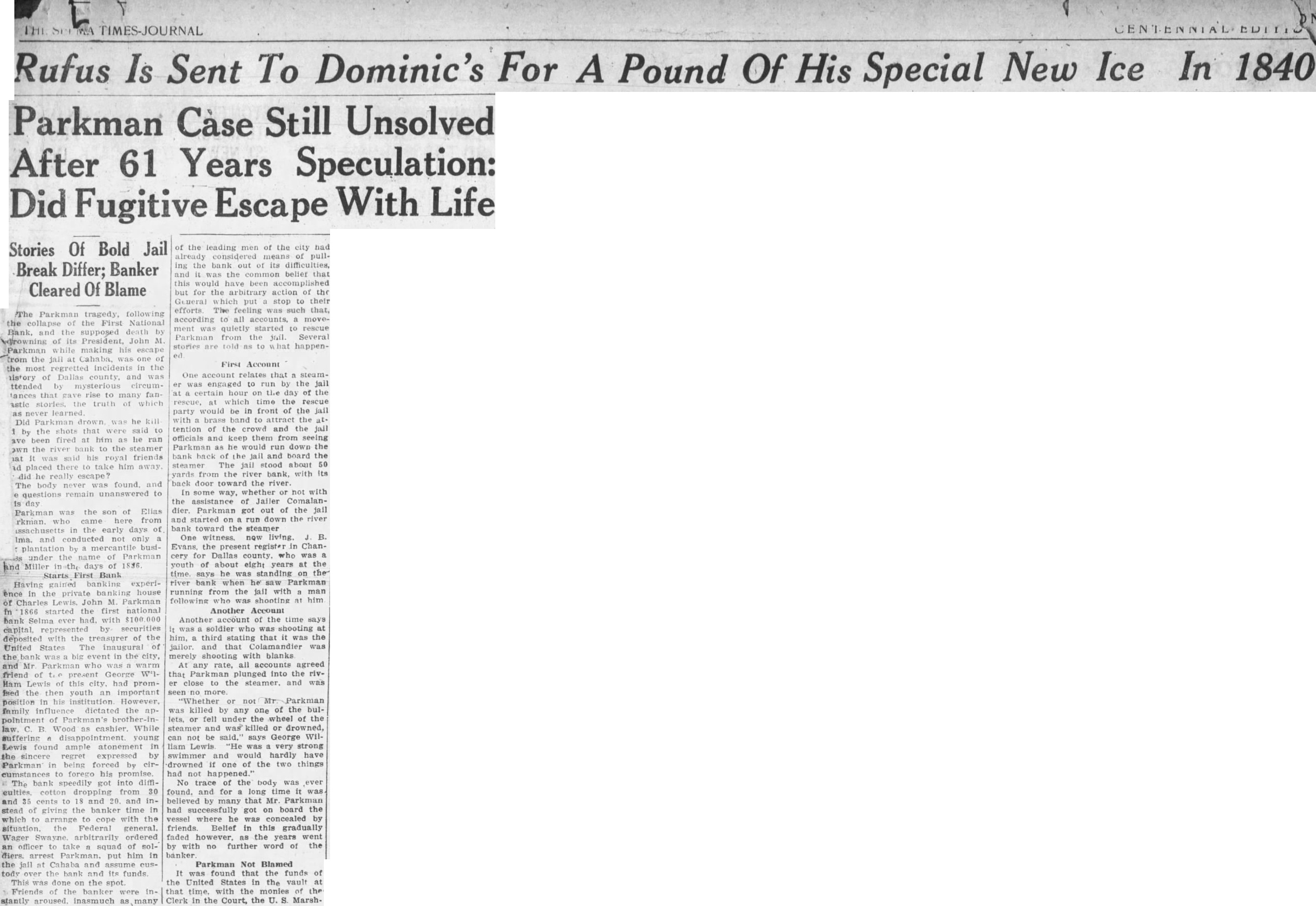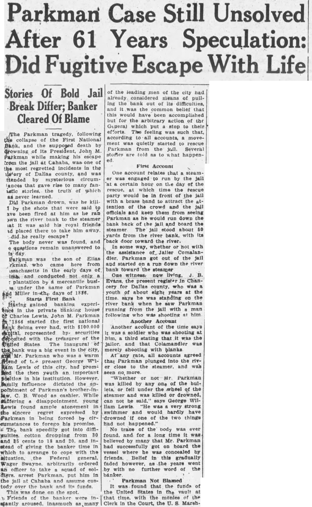 Parkman Case Still Unsolved After 61 Years Speculation: Did Fugitive Escape With Life Stories Of Bold Jail Break Differ; Banker Cleared Of Blame The Parkman tragedy. following the collapse of the First National Bank, and the supposed death by drowning of its President, John M. Parkman while making his escape from the jail at Cahaba, was one of the most regretted incidents in the alstory of Dallas county. and was ttended by mysterious circumiances that gave rise to many fanastic stories, the truth of which never learned. Did Parkman drown, was he killby the shots that were said to ave been fired at him as he ran awn the river bank to the steamer at It was said his royal friends id placed there to take him away. did he really escape? The body never was found. and questions remain unanswered to is day Parkman was the son of Elias rkman. who came here from assachusetts in the early days of Ima. and conducted not only plantation by mercantile busfunder the name of Parkman Miller in-the days of 1836. Starts First Bank Having gained banking experlence in the private banking house or Charles Lewis. John M. Parkman *1866 started the first national Bank Selma ever had. with $100.000 capital, represented by, securities deposited with the treasurer of the United States The inaugural of was big event in the city, Mr. Parkman who was warm friend of the present George W"1Nam Lewis of this city. had promlined the then youth an important position in his institution. However. family influence dictated the appointment of brother-inlaw. C. B. Wood as cashier. While suffering disappointment. young Lewis found ample atonement in the sincere regret expressed by Parkman in being forced by circumstances to forego his promise. The bank speedily got into diffisuities. cotton dropping from 30 and 36 cents to 18 and 20. and instead of giving the banker time in which to arrange to cope with the situation. the Federal general. Wager Swayne. arbitrarily ordered an officer to take squad of soldiers. arrest Parkman. put him in the jall at Cahaba and assume custody over the bank and its funds. This was done on the spot. Friends of the banker were instantly aroused. inasmuch many of the leading men of the city had already considered means of pullIng the bank out of its difficulties, and it was the common belief that this would have been accomplished but for the arbitrary action of the General which put stop to their efforts The feeling was such that, according to all accounts, movement was quietly started to rescue Parkman from the juil. Several stories are told as to what happened. First Account One account relates that steamwas engaged to run by the jail at certain hour on the day of the rescue, at which time the rescue party would be in front of the jail with brass band to attract the attention of the crowd and the jall officials and keep them from seeing Parkman as he would run down the bank back of the jail and board the steamer The jail stood about 50 yards from the river bank, with its back door toward the river. In some way, whether or not with the assistance of_ Jailer Comalandier. Parkman got out of the jail and started on run down the river bank toward the steamer One witness now living. B. Evans. the present register in Chancery for Dallas county. who was youth of about eight years at the time. says he was standing on the river bank when he saw Parkman running from the jail with man following who was shooting at him Another Account Another account of the time says It was soldier who was shooting at him, third stating that it was the jailor. and that Colamandier was merely shooting with blanks At any rate, all accounts agreed that Parkman plunged into the river close to the steamer. and was seen more. "Whether or not Mr Parkman was killed by any one of the bullets. or fell under the wheel of the steamer and was killed or drowned, can not be said." says George William Lewis "He was very strong swimmer and would hardly have drowned If one of the two things had not happened." No trace of the body was ever found. and for a long time it was believed by many that Mr. Parkman had successfully got on board the vessel where he was concealed by friends. Belief in this gradually faded however, as the years went by with no further word of the banker Parkman Not Blamed It was found that the funds of the United States in the vault at that time. with the monies of the
