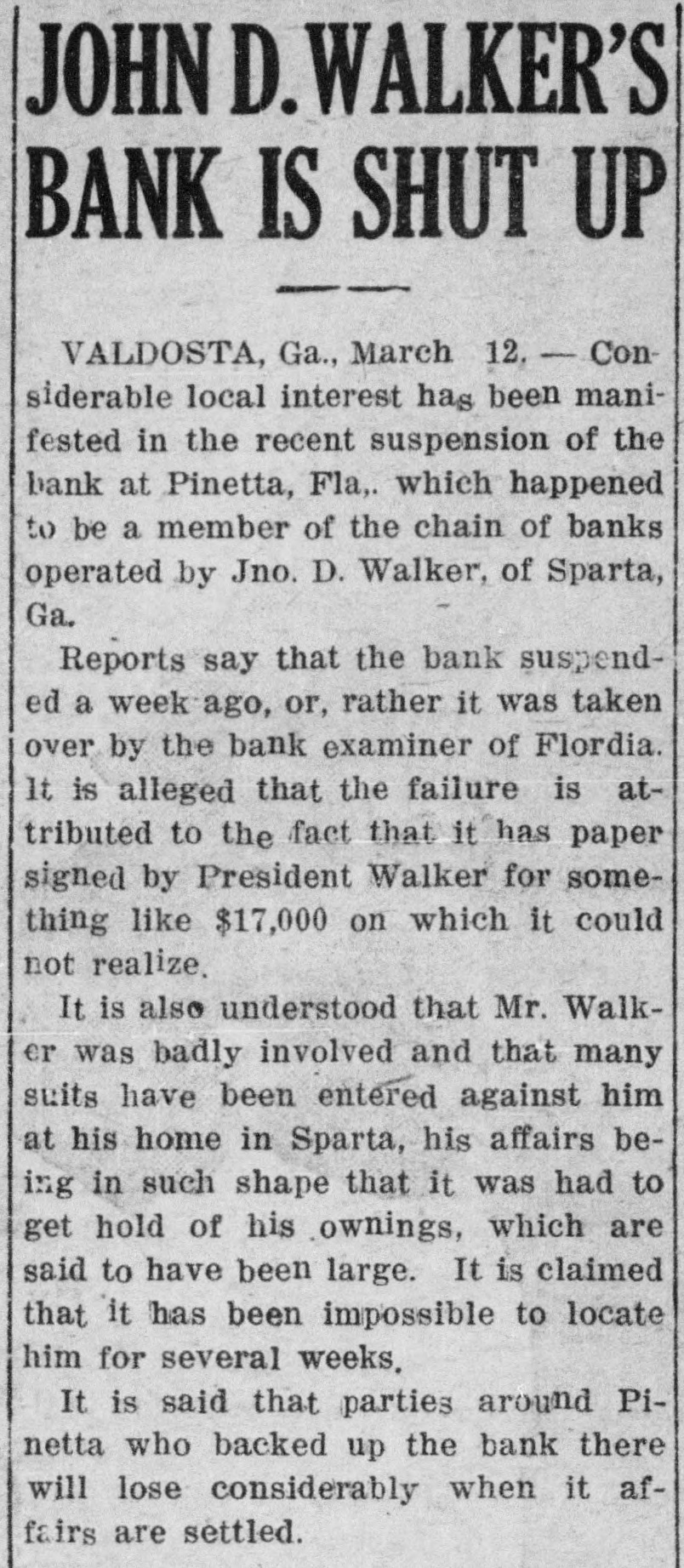 JOHN D.WALKER'S BANK IS SHUT UP VALDOSTA, Ga., March 12. - Considerable local interest has been manifested in the recent suspension of the bank at Pinetta, Fla,. which happened to be a member of the chain of banks operated by Jno. D. Walker, of Sparta, Ga. Reports say that the bank suspended a week ago, or, rather it was taken over by the bank examiner of Flordia. It is alleged that the failure is attributed to the fact that it has paper signed by President Walker for something like $17,000 on which it could not realize. It is also understood that Mr. Walker was badly involved and that many suits have been entered against him at his home in Sparta, his affairs being in such shape that it was had to get hold of his ownings, which are said to have been large. It is claimed that it has been impossible to locate him for several weeks. It is said that parties around Pinetta who backed up the bank there will lose considerably when it affairs are settled.