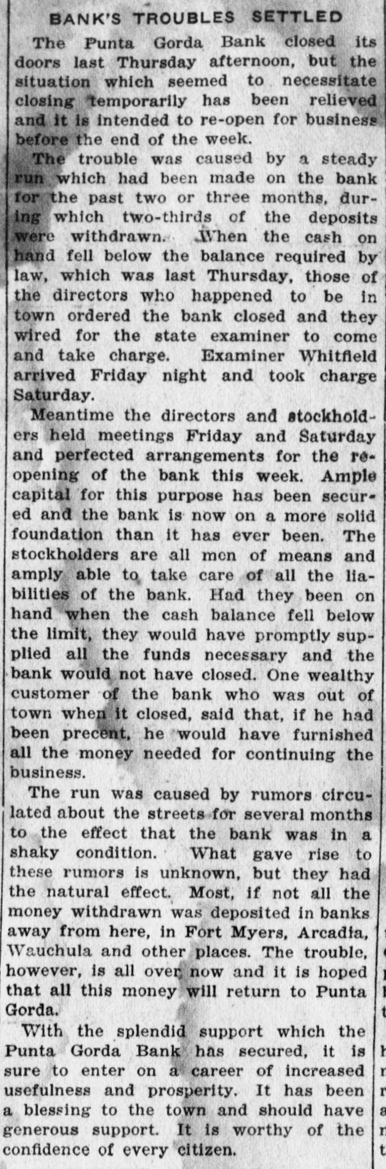 BANK'S TROUBLES SETTLED The Punta Gorda Bank closed its doors last Thursday afternoon, but the situation which seemed to necessitate closing temporarily has been relieved and it is intended to re-open for business before the end of the week. The trouble was caused by a steady run which had been made on the bank for the past two or three months, during which two-thirds of the deposits were withdrawn. When the cash on hand fell below the balance required by law, which was last Thursday, those of the directors who happened to be in town ordered the bank closed and they wired for the state examiner to come and take charge. Examiner Whitfield arrived Friday night and took charge Saturday. Meantime the directors and stockholders held meetings Friday and Saturday and perfected arrangements for the reopening of the bank this week. Ample capital for this purpose has been secured and the bank is now on a more solid foundation than it has ever been. The stockholders are all men of means and amply able to take care of all the liabilities of the bank. Had they been on hand when the cash balance fell below the limit, they would have promptly supplied all the funds necessary and the bank would not have closed. One wealthy customer of the bank who was out of town when it closed, said that, if he had been precent, he would have furnished all the money needed for continuing the business. The run was caused by rumors circulated about the streets for several months to the effect that the bank was in a shaky condition. What gave rise to these rumors is unknown, but they had the natural effect. Most, if not all the money withdrawn was deposited in banks away from here, in Fort Myers, Arcadia, Wauchula and other places. The trouble, however, is all over now and it is hoped I 1 that all this money will return to Punta Gorda. t With the splendid support which the h Punta Gorda Bank has secured, it is r sure to enter on a career of increased r usefulness and prosperity. It has been a a blessing to the town and should have n generous support. It is worthy of the t confidence of every citizen.