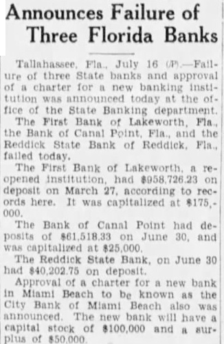 The Bank of Canal Point had deJune 30, and The Reddick State on June 30 had new bank Miami Beach be known Bank Miami Beach The will capital stock $100,000 and sur-