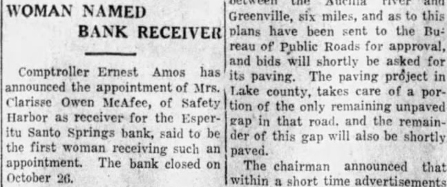 Aucilla river and WOMAN NAMED Greenville, six miles, and to this BANK RECEIVER plans have been sent to the Bu- Comptroller Ernest Amos has paving. The paving project in announced the appointment of Lake county, takes care porClarisse Owen McAfee, of Safety tion of the only remaining unpaved Harbor as receiver for the Esper- the gap that road. and remainitu Santo Springs bank, said to der of this will also be shortly gap the first woman receiving such an paved. appointment. The bank closed on The chairman announced that October within short time