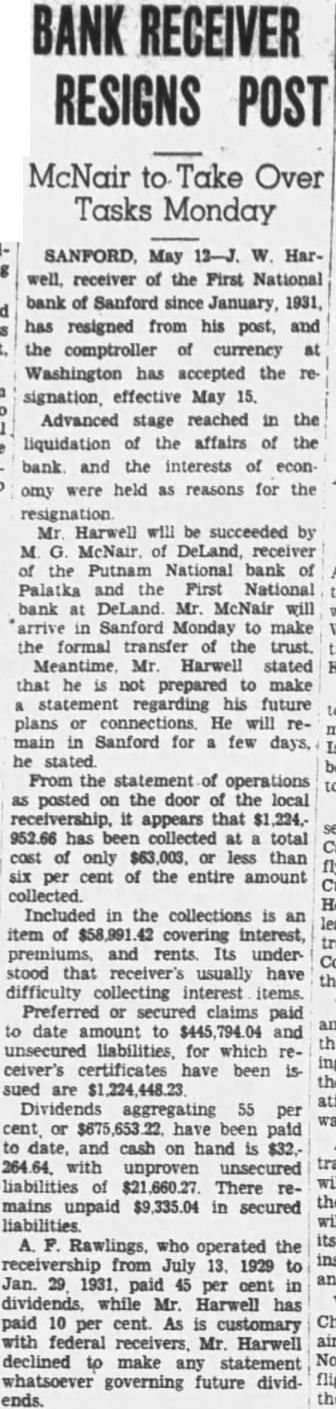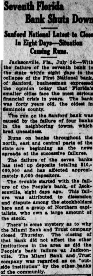 Authorities at Work on Reorganization or Liquidation of Institutions. ONE OF TWO IN SANFORD CLOSED DOORS TODAY Seven Now Have Suspended, Two at Daytona Beach Going Out of Business Yesterday. By the Associated Press. JACKSONVILLE, Fla., July 13.-App.oximately $9,000,000 in depositors' money was tied up today as State and Federal banking authorities worked toward the reorganization or liquidation of six Florida banks which have closed within the last eight days, five of them since Thursday. The latest to fail were two in Daytona Beach, the Merchants' Bank & Trust Co., and the Atlantic Bank & Trust Co., which suspended business yesterday. Both were closed, according to notices on their doors, by State bank examiners pending reorganization for the protection of their customers. The failure of the Daytona Beach banks brought a run on the two remaining institutions in the city, which continued business despite heavy withdrawals. De Land, in the same county, suffered closing of the only two banks in the city, the Volusia County Bank & Trust Co. and the First National Bank, Thursday, while the Colonial Bank & Trust Co. of Miami failed to open on that day. The People's Bank of Jacksonville closed last Friday morning. While banking department officials from the State and Federal Governments audited the books of the six banks, John L. Fouts, president of four other closed Central Florida banks, prepared for preliminary hearing on three charges involving violation of State banking laws. Fouts was president and director of the State Bank of Bartow, the First National Bank of Lakeland, the First National Bank of Auburndale and the State Bank of Winter Haven. Fouts is alleged to have loaned himself $5,000 from one of the banks without the consent of the directors, at a time when the bank was not in a position to make the loan, and to have altered minutes of a directors' meeting to show that the loan was approved. Sanford Bank Closes. SANFORD, Fla., July 13 (AP).-The First National Bank, oldest banking : institution in Seminole County, was closed today with a notice on the doors that its affairs had been placed in the hands of the controller. The notice read: "In order to protect the interests of all its depositors, this bank is closed by its directors and its affairs have been placed in the hands of the controller of currency." The First National was more than 40 years old. It had resourcesof $2,200,000 and deposits of $1,800,000. Only one other bank remains here, the Sanford Atlantic National Bank.