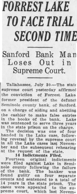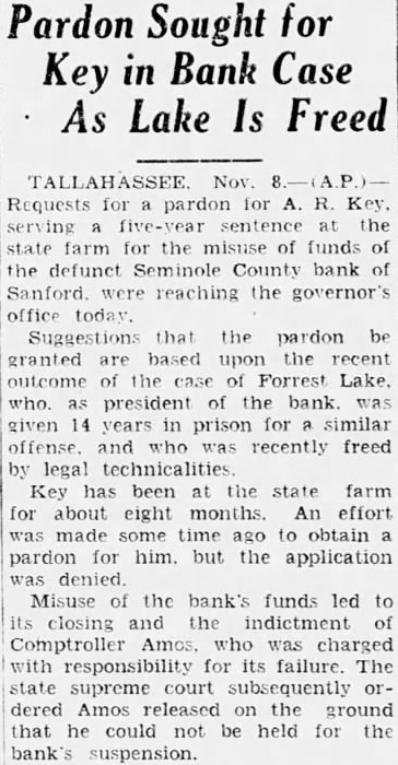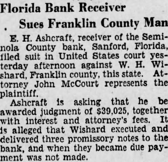 Florida Bank Receiver Sues Franklin County Man E. H. Ashcraft, receiver of the Seminola County bank, Sanford, Florida, filed suit in United States court yesterday afternoon against W. H. Wishard, Franklin county, this state. Attorney John McCourt represents the plaintiff. Ashcraft is asking that he be awarded judgment of $39,025, together with interest and attorney's fees. It is alleged that Wishard executed and delivered three promissory notes to the bank, and when they became due payment was not made.