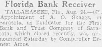 Appointment of A. O. Skaggs, of Sarasota, as liquidator for the First Bank and Trust Company of Sarasota, which closed recently was an Saturday by Comptroller Ernest Amos