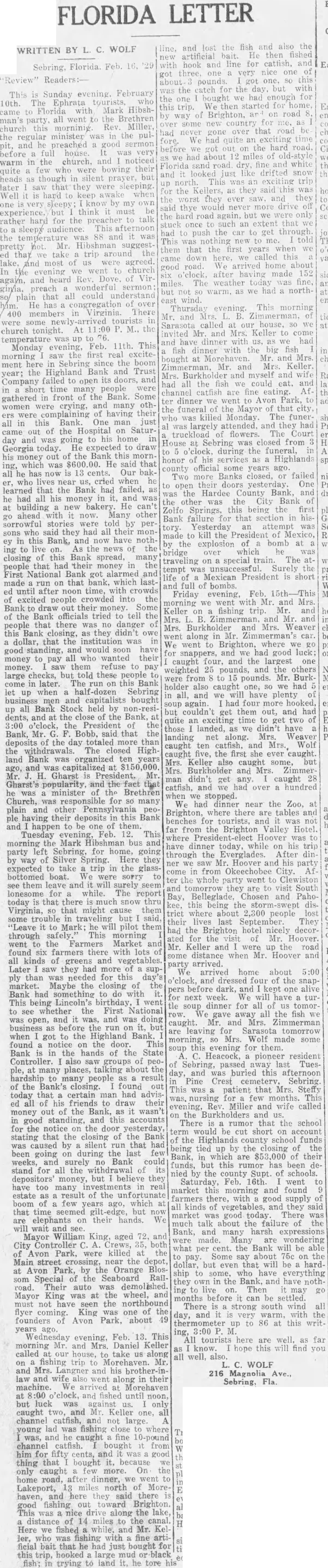 FLORIDA LETTER WRITTEN BY C. WOLF Sebring, Feb. This Sunday evening. February The Ephrata tourists, who 10th. Florida with Mark Hibshcame man's party, all went to the Brethren church this morning Rev. Miller, had minister was in the pulthe regular and preached good sermon before full house. was very warm in the church, and noticed quite few who were bowing their heads though in silent prayer, but later they were sleeping Well hard to keep awake when one very sleepy; know by my but think must rather hard for the preacher talk sleepx audience. This afternoon temperature was 88 and it was Mr. Hibshman suggest pretty not. that we take trip around the lake, and most of us were agreed In the evening we went to church again, and heard Rev. Dove. of Vir ginfia, preach wonderful sermon plain that all could understand He has congregation of over 400 members in Virginia. There were some tourists church tonight. At P. M., the was up to 76. temperature Monday evening, Feb. 11th. This morning saw the first real excite bought ment here in Sebring since the boom year; the Highland Bank and Trust Company failed to open its doors, and had short time many people were gathered in front of the Bank. Some women were crying, and many othwere complaining of having their all in this Bank. One man just came out of the Hospital on Saturday and was going to his home Georgia today. He expected to draw his money out of the Bank this morn. ing, which was $600.00. He said that all he has now is 13 cents. Our bakwho near us, cried when learned that the Bank had failed, was had all his money in it, and was at building new bakery. He can't ahead with now. Many other sorrowful stories were told by per sons who said they had all their ey in this Bank, and now have noth ing to live As the news of the bridge closing of this Bank spread, many people that had their money in the tempt First National Bank got alarmed and made run on that bank, which lastand until after noon time, with crowds excited people crowded into the Bank to draw their money. Some the Bank officials tried to tell the Mrs. people that there was no danger Mrs. Bank closing, as they didn't owe dollar, that the institution was in good standing, and would have money to pay all who wanted their money. them refuse to pay large checks, but told these people to later. The run on this Bank come let up when half-dozen Sebring all, business men and capitalists bought soup up all Bank Stock held by non-resibut dents, and at the close of the Bank, 3:00 o'clock, the Bank, Mr. Bobb, said that the deposits of the day totaled more than caught withdrawals. The closed Highland Bank was organized ten years ago, and was capitalized at $150,000 Gharst is President. Mr. man Gharst's popularity, and he was minister of the Brethren when Church, was responsible for so many plain and other people having their deposits in this Bank and happen to be one them. Tuesday Feb. This morning the Mark bus and party left Sebring, for home, going by way of Silver Spring. Here they expected to take trip in the glassbottomed boat. We were SOFFY to see them leave and will surely seem lonesome for while. The report today that there much snow thru Virginia, SO that might cause them some trouble traveling but said, 'Leave to Mark; he will pilot them through safely. This morning ated went to the Farmers Market and found six farmers there with lots all kinds of greens and party Later saw they had more of supply than was needed for this market. Maybe the closing of the Bank had something to do with This being Lincoln's birthday, went to see whether the First National open, and it was, and was doing before the run but when got to the Highland Bank found notice on the door. This Bank in the hands of the State Controller. also saw groups of people, at many places, talking about the hardship many people as result of the Bank's closing. found out today that certain had advised all his friends to draw their money out of the Bank, as it wasn't this accounts for the notice on the door yesterday stating that the closing of the Bank was caused by silent run that had been going on during the last few weeks, and surely Bank could stand for all the withdrawal of money, but believe they have too many in estate as result of the boom of few ago, which that time but are elephants on their hands. We will wait and Mayor William King, aged 72, City Controller A. Crews, 35, both Avon Park, were killed at the Main street crossing, near the depot, at Avon Park, by the Orange Blossom Special of the Seaboard Railroad. Their auto demolished ing Mayor King at the wheel, and must not have seen the northbound flyer King was one of the founders of Avon Park, about years ing, Wednesday evening, Feb. 13. This morning Mr. and Mrs. Daniel Keller called our house, to take us along all on fishing trip Mr. and Mrs. Langner and his brother-inand wife also went along in their machine. arrived at Morehaven at 8:00 o'clock, and fished until noon, but luck against only caught two, and Mr. Keller one, all channel catfish, and not large young lad was fishing close to where was, and caught fine 10-pound channel catfish. bought from him for fifty cents, and was good thing that bought it. because only caught more. On the home road, dinner, we went to Lakeport, 13 miles north of Morehaven, and here they said there good fishing out toward Brighton. was nice drive along the lake, distance of 14 miles to the canal. Here we fished while, and Mr. Keller, who was fishing with fine artificial bait that he had just bought for this trip, hooked large mud black fish; in trying to land it, he tore line, and lost the fish and also the then fished artificial with hook and line for catfish, and got three a very of one, this the catch for the with the one bought we had enough for trip. for by way of Brighton, on road for some that road never We had an time before got the hard road, had about 12 miles of they when arrived after This called MT and Mrs. Keller fish the 