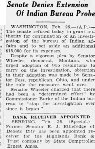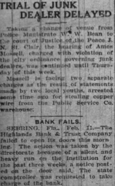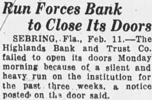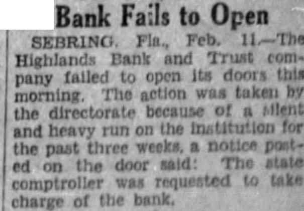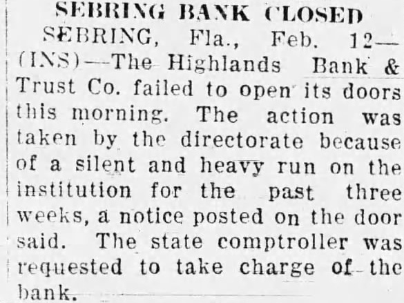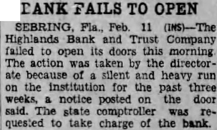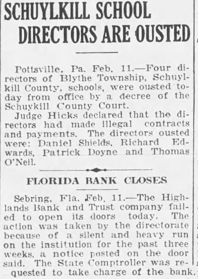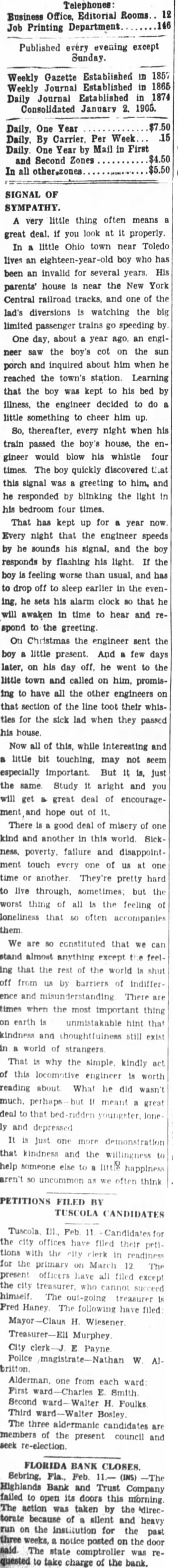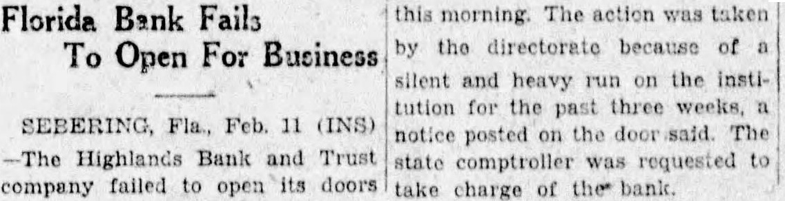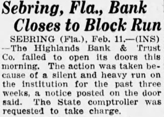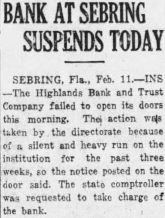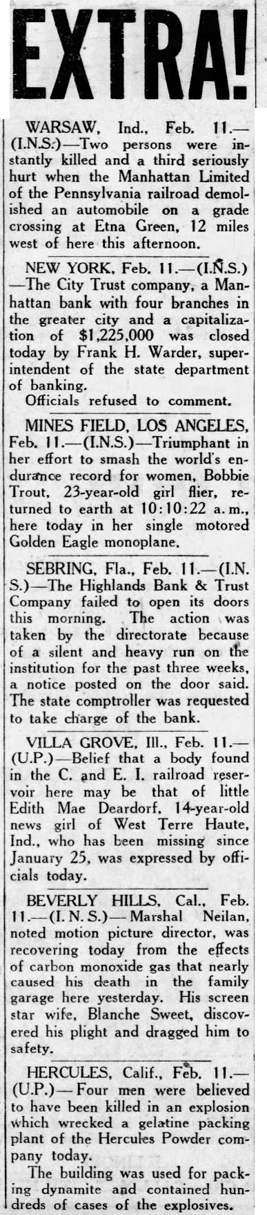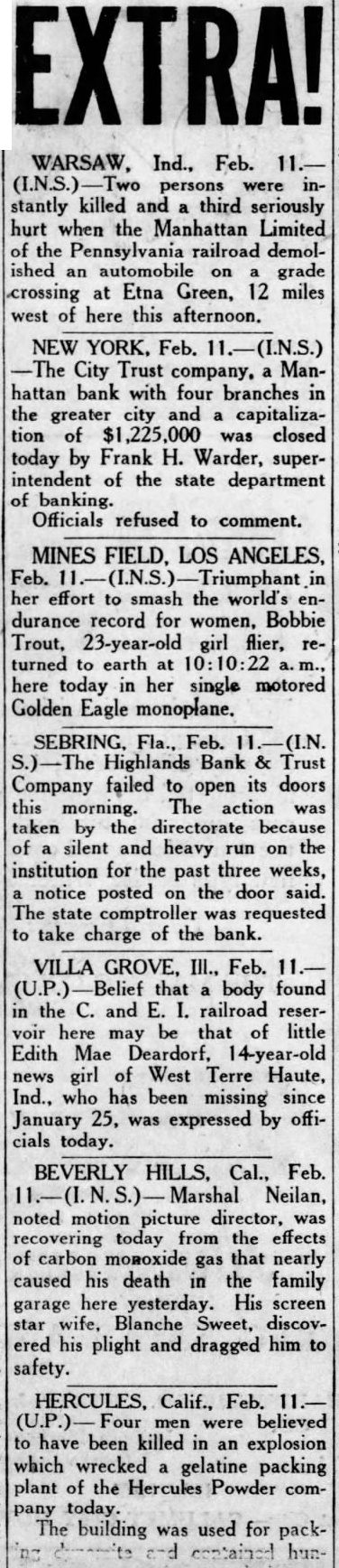 EXTRA! Ind., Feb. (I.N.S.) were inpersons stantly killed and a third seriously hurt when the Manhattan Limited of the Pennsylvania railroad demolished an automobile on grade crossing at Etna Green, 12 miles west of here this afternoon. NEW YORK, Feb. City Trust company. Manhattan bank with four branches in the greater city and capitalization of $1,225,000 closed today by Frank H. Warder, superintendent of the state department of banking. Officials refused to comment. MINES FIELD, LOS ANGELES, Feb. in her effort to smash the world's endurance record for women, Bobbie Trout, 23-year-old girl flier, returned to earth at 10:10:22 here today in her single motored Golden Eagle monoplane. SEBRING, Fla., Feb. Highlands Bank & Trust Company failed to open its doors this morning. The action was taken by directorate because of silent and heavy run on the institution for the past three weeks, notice posted on the door said. The state comptroller was requested to take charge of the bank. VILLA GROVE, III., Feb. (U.P.) Belief that body found in the C. and E. I. railroad reservoir here may be that of little Edith Mae Deardorf, 14-year-old news girl of West Terre Haute, Ind., who has been missing since January 25, was expressed by officials today. BEVERLY HILLS. Cal., Feb. Marshal Neilan, noted motion picture director, was recovering today from the effects of carbon monoxide gas that nearly caused his death in the family garage here yesterday. His screen star wife, Blanche Sweet, discovered his plight and dragged him to safety. HERCULES, Calif., Feb. Four men were believed to have been killed in an explosion which wrecked gelatine packing plant of the Hercules Powder company today. The building was used for packhun-