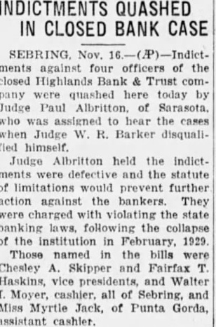 INDICTMENTS QUASHED IN CLOSED BANK CASE ments against officers the closed Highlands Bank Trust pany today by Judge Paul Albritton. of Sarasota. the Judge W. Barker disqualiJudge Albritton held the indictand the statute limitations further action against the bankers They were the state the the in 1929 Those named the bills Chesley Skipper Fairfax Haskins, and Walter Moyer, all Sebring, and Miss Myrtle Jack, of Punta Gorda, assistant cashier.