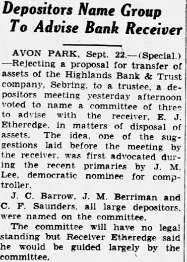 AVON PARK, Sept. 22.-(Special.) Rejecting a proposal for transfer of assets of the Highlands Bank & Trust company, Sebring. to a trustee. a depositors meeting yesterday afternoon voted to name committee of three to advise with the receiver. E. J Etheredge in matters of disposal of assets. The idea, one of the suggestions laid before the meeting by the receiver. was first advocated during the recent primaries by J. M Lee. democratic nominee for compC. Barrow. J. M. Berriman and C. F. Saunders. all large depositors. were named on the committee. The committee will have no legal standing but Receiver Etheredge said he would be guided largely by the committee.
