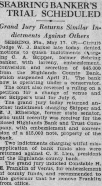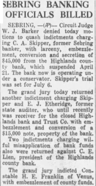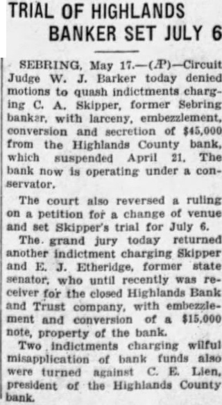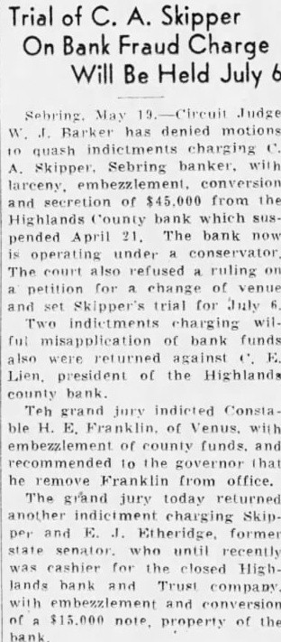 SEBRING. Circuit Judge Barker denied today motions quash chargformer Sebring with larceny, embezzlesecretion of $45,000 from Highlands counbank, which suspended April The bank now operating conservator. Skipper's trial for July The grand jury today returned charging Skipper and Etheridge, former state auditor. until recently receiver for the closed Highlands bank and Trust Co. with embezzlement and property of the bank. indictments wilmisapplication of bank funds were returned against Lien, of the Highlands county bank. The grand jury indicted Constable Franklin of Venus, embezzlement of county funds.