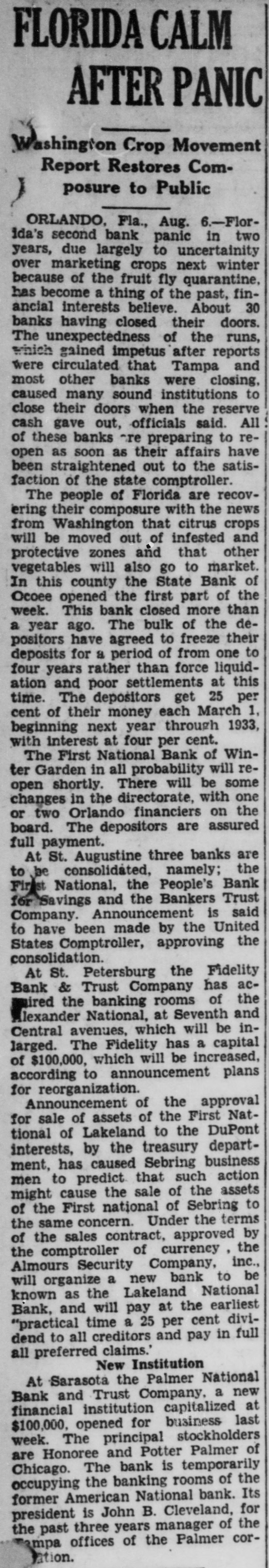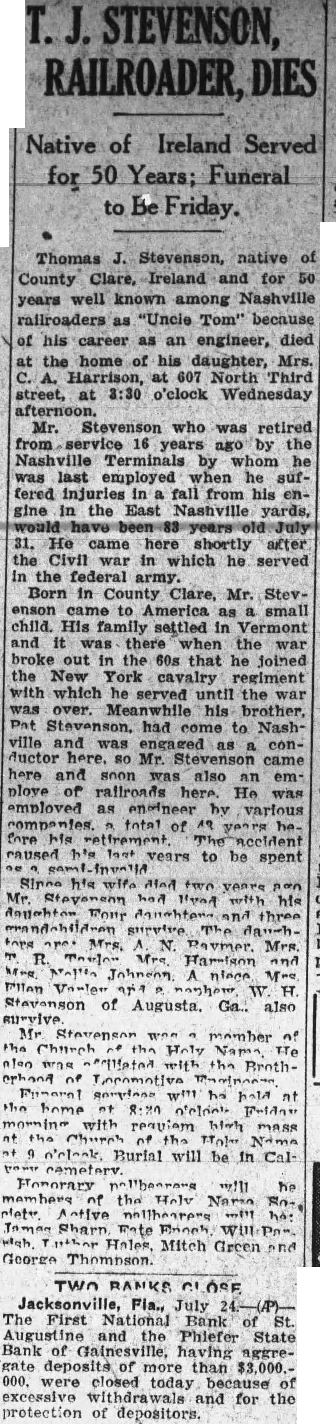 STEVENSON, RAILROADER, Native of Ireland Served for 50 Years; Funeral to Be Friday. Thomas J. Stevenson, native of County Clare, Ireland and for 50 years well known among Nashville railroaders as "Uncie Tom" because of his career as an engineer, died at the home of his daughter, Mrs. Harrison, 607 North Third street, at 3:30 o'clock Wednesday Mr. Stevenson who was retired from 16 years by the Nashville Terminals by whom was employed when he suffered injuries fall from his engine in the East Nashville yards, 31. He came here shortly after the Civil in which he served in the Born in County Clare, Mr. Stevenson to America as small child. His family settled in Vermont and it there when the war broke out in the 60s that he joined the New York cavalry regiment with which he served until the over. Meanwhile his brother, Pat had come to Nashville and was engaged conductor here. Mr. Stevenson came here and soon was also an em: ploye railroads here. He was employed as engineer by various companies. total of years hefore his retirement accident caused his years to be spent Since his wife died two years Mr. had lived with his deughter Four and three Mrs. Stevenson of Augusta. Ga.. also survive Mr. member the Church the Holy TTe also was -"Mated with the Brothnt home Friday with high mass o'cleak. Burial will be in CalHonorary will he members the Helv Name Active he: Holes, Mitch Green and George Thompson. TWO BANKS OSE Jacksonville, Fla., July The First National Bank of St. Augustine and the Phiefer State Bank of Gainesville, having aggregate more than $3,000.000, were closed today excessive withdrawals and for the protection of depositors.