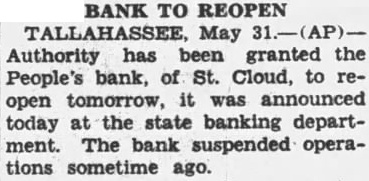 FIRST AMERICAN HERE ADDS GRATIFICATION Twenty-five Banks Closed In State Are Reopened In Last Nine Months BANK OPENS May thority has been granted the People's Bank, St. Cloud to reopen was announced today the state banking department. The bank pended operations sometime ago. By the Associated Press May by the state banking the rapid succession of bank reopenings taking Reopening of the Bank of Orange Trust and the American Bank and of West Palm the latest of the institutions announce resumption of business satisfaction here by the department officials. The was declared. has due largely operative efforts extended among banking department officials and heads the institutions, and excellent prevailing among the public Particularly the latter, such progress could not be accomplished, was stated. Since banks had have reopened. according to revised list compiled by banking department heads. Two other institutions and later closed Following list of the reopened banks of the state, their location. and the date their repoening: Citizens Bank of Bushnell, Bushnell, Feb. 1927 Delray Bank and Bank and St. Oct. Bank County Sept. 14. Bank Dade City, Dade City, Palatka Bank and Trust company, Palatka, Bank GroveDec. Bank of Umatilla, Umatilla, 1926: First State Bank Clermont, ClerSept 28, 1926 Citizens Bank Eustis, Oct. 1926: Bank Mount Dora, Mount Dora, Sept. 1926: Bank of Aug. 24, 1926 Bank of OakOct. Bank of Live Oak. Live Oak, Sept. Bank Sept. 13, 1926 Lake Butler, Dec. Bank of Monticello, 14, 1926: Polk County Trust Lakeland. 28, State Bank. Lake 1926: East Florida Stuart Bank and Trust company. Stuart, Oct. 1926: People's Bank Sept 1926: Palmetto State Bank. Palmetto, May 19. 1927: Bank Orange and Trust company. Orlando, May 23. 1927, and First American Bank and Trust company. West Palm Beach, May