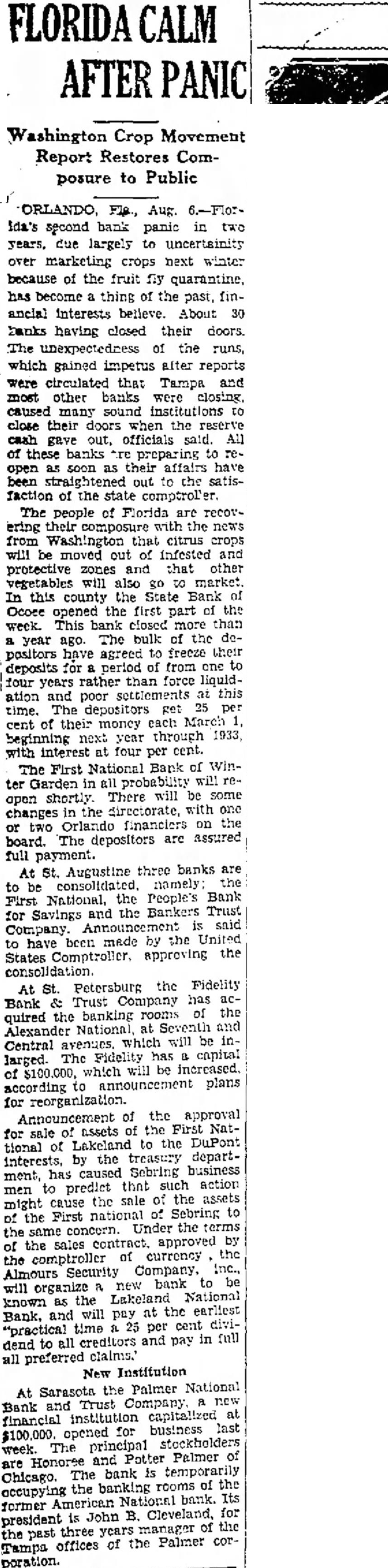 AFTER Washington Crop Movement Report Restores Composure to Public ida's second bank panic in two years. due largely to uncertainity over marketing crops next winter because of the fruit fly quarantine, has become a thing of the past, financial interests believe. About 30 banks having closed their doors. The unexpectedness of the runs, which gained impetus after reports were circulated that Tampa and most other banks were closing. caused many sound institutions to close their doors when the reserve cash gave out, officials said. All of these banks *re preparing to reopen soon as their affairs have been straightened out to the satisfaction of the state comptrol'er. The people of Florida are recovering their composure with the news from Washington that citrus crops will be moved out of infested and protective zones and that other vegetables will also go to market In this county the State Bank of Ocoee opened the first part of the week. This bank closed more than year ago. The bulk of the depositors have agreed to frecze their deposits for period of from one to four years rather than force liquidation and poor settlements at this time. The depositors get 25 per cent of their money each March beginning next year through 1933, with interest at four per cent. The First National Bank of Winter Garden in all probability will reopen shortly. There will be some changes in the directorate, with one or two Orlando financiers on the board. The depositors are assured full payment. At St. Augustine three banks are be consolidated. namely: the First National, the People's Bank for Savings and the Bankers Trust Company. Announcement said have been made by the United States Comptroller, approving the consolidation. Petersburg the Fidelity At St. Bank & Trust Company has acrooms of the quired the banking Alexander National at Seventh and Central which will be Fidelity has capital The larged. of $100.000, which will be increased. to announcement plans according for reorganization. of the approval Announcement for sale of assets of the First Nattional of Lakeland to the DuPont interests, by the treasury department, has caused Sebring business that such action to predict men the sale of the assets might cause national of Sebring to the First Under the terms same concern. of the the sales contract. approved the by comptroller of currency the Inc., Almours Security bank to be will organize a new Lakeland National as the known Bank. and will pay at the earliest "practical time 25 per cent dividend to all creditors and pay in full preferred claims.' New Institution At Sarasota the Palmer National Company new Bank and Trust capitalized at institution financial business last opened for $100,000. stockholders The principal week. Potter Palmer of Honoree and are bank is temporarily Chicago. The rooms of the the banking occupying National bank. Its American president former is John B. manager Cleveland, of the for past three years the the Palmer coroffices of Tampa poration.