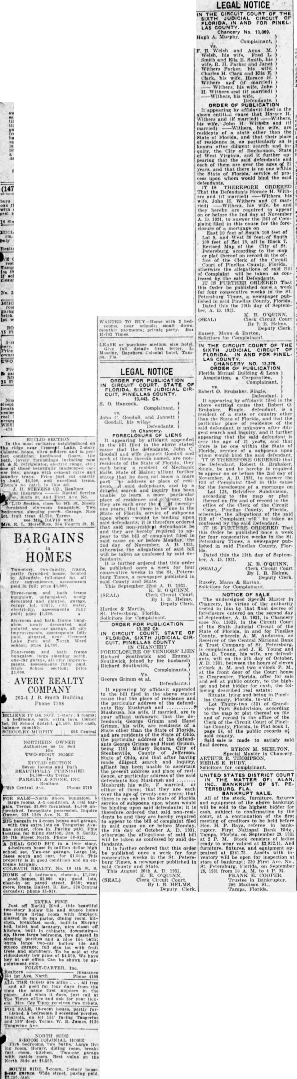 TO BUY with Box Times In the Colonial with terms. Insurance LID 9th sleeping fruit trees. 354 BELIEVE rooms: HI School district balance -MURPHY Central NORTHERN OWNER HOME SECTION PARSLEY INC. Realtors Ave Phone 5710 Central FOR SALE Shore real gain. Terms Inquire 226 BIG room with two extra Paying Fine A REAL GOOD house million dollar high school faces and treme and exCOLBATH No. 4th on Est., 526 Central (arcade): EXTRA FINE Just off this beautiful has hollow living tile and dining breakfast Murphy lavatory, closet off built large two glassed in sleeping and nice tile extra large full with trees and sold the key Can be by pointment FOLEY Inc. Realtors 1st North Phone ALL THE tickets are all good four the time the the And Times and for FOR 10-room house, partly and Terms. W. B. James, 2130 Tangerine NORTH SIDE 8-ROOM HOME Best value on the North Side SOUTH SIDE -story house Wide and Jannett John FORECLOSU OF LIENS appearing by to the bill filed the Goodall and are nonState of being resident further states that not know part address place and by and inquiry has unable more place are the one of upon binding upon that required the bill of filed before 2nd the allegations said bill will be as by said further ordered that this order published the burg in County and 22nd D. This September (SEAL) By Deputy Hardee Martin ORDER FOR PUBLICATION CIRCUIT STATE OF IN JUDICIAL CIR. CUIT. COUNTY OF VENDORS' LIEN Richard and Emma) joined by her husband) Richard Vs. George Grimm et al, It appearing by affidavit appended to bill that the place of above the the defendants Roy and his wife, If are your affiant that defendants George Hazel of than of Florida, and are residents of the of the particular Grimm address the defendants George and Hazel 1101 Millary City of being of State of Ohio, and that after made diligent search and affiant has ascertain the address and place or address the said defendants Mushrush married, and Mushrush his either of that they are each the that age there no in the State of Florida whom be binding upon said resi that said dents be and they are hereby required to bill filed said or the 5th October D. the allegations said be taken as by said defurther ordered that this order be published once week for in the Petersburg Times published in County This August 26th D. (SEAL) Clerk Deputy Clerk. LEGAL NOTICE IN THE CIRCUIT COURT THE SIXTH JUDICIAL CIRCUIT FLORIDA, AND FOR PINEL. LAS COUNTY. Chancery No. 13,069. Hugh A. Welsh and Anna his Fred Smith and Ella Smith, wife, R. Parker and Janet Withers Parker, his Charles H. Clark and Ella Clark, his wife, Horace Withers (if married) his John H. Withers and (if married) Withers, his wife ORDER OF PUBLICATION It affidavit the appearing Horace H. above cause Withers his wife, John Withers and married) his wife, residents state other than of that of residence after search the Virginia, pearing that the said each over the ages and is State of service of cess upon bind the said IT IS ORDERED That the Defendants his ers John Withers and marthey hereby required appear on the 2nd day A. Bill plaint this for the in East 10 of Sout 100 feet and South fee all in Block Revised Map of the City to the map or plat of the Circuit Court of the of said Bill of Complaint will be taken as IT RTHER ORDERED That this Order be published for four weeks in the St. said Florida. Dated this the 19th day of SeptemD. 1931. (SEAL) By Deputy Clerk. Bussey Mann Barton, IN THE CIRCUIT COURT OF THE SIXTH JUDICIA FLORIDA AND FOR PINEL LAS CHANCERY NO. 13,376. ORDER Building Robert O. Brubaker. Single, It appearing by affidavit entitled Robert resident or than the of and of residence defendant unknown after gent that defendant over the age of that there no one within the State of THEREFORE the Robert on the day to the filed for the of mortgage on Lot 124, the thereof file and the of the Circuit Bill Complaint taken said IT THRE ORDERED That this Order be for in the Times newspaper lished in Pinellas County, Dated this the 19th day of SeptemA. (SEAL)/ By Helms, Deputy Clerk Bussey. Mann & Barton, Solicitors for Complainant NOTICE OF SALE The Master Chancery the authority vested him by that fina decree day of D. Chancery case the Court of the State of Florida in for M. as Receiver of & Trust Company Petersburg. and and Alta D. his defendon 5th day A'. the two M. at the front the Court offer for sale and sell public the high est the real and being Pinellas Florida Lot (32) of Grandview Park to the map or plat thereof and of the office the Clerk the Circuit Plat book page the public records of county Said sale made to satisfy final decree. BYRON M. SKELTON. Chancery ARTHUR THOMPSON, MERLE Solicitors for complainant. UNITED STATES DISTRICT COURT IN MATTER BANKRUPT OF ST. PE. BANKRUPT SALE. All of the stock furniture fixtures the will be sold to the highest bidder for cash, subject confirmat the court, continuation of the first creditors to be held meeting Hon. H. in bank- Bldg. First National Bank on September 1931 : M. Stock ready $2,922.11 And furniture. and Assets equipment with appraised inventory will be for inspection at First No. Petersburg. on M. 28, 1931 from to FRANK E. COOPER. Trustee in 206 Madison Tampa, Florida.