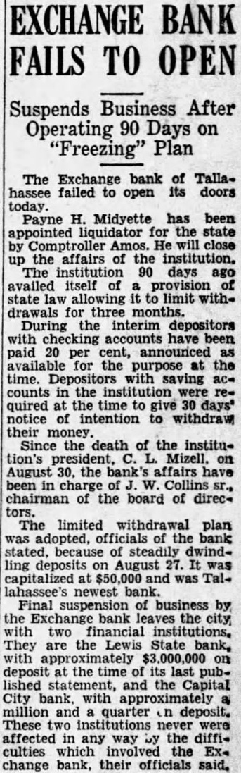 EXCHANGE BANK FAILS TO OPEN Suspends Business After Operating Days on "Freezing" The Exchange bank of Tallahassee failed to open its doors today. Payne H. Midyette has been appointed liquidator for the state by Comptroller Amos. the affairs the institution. The institution days availed itself of provision allowing limit withdrawals for three months. During the interim checking have been paid 20 per cent, available for the the time. Depositors with saving counts in the institution required the time 30 notice of intention to withdraw their money. Since the death of the institupresident, on August 30, the bank's affairs have been in charge Collins chairman of the board of direcThe limited withdrawal plan adopted, officials the bank stated, because of steadily ling deposits August capitalized was Tallahassee's newest bank. Final suspension of business by the Exchange bank leaves the city, two financial institutions. They are the Lewis State bank, deposit the time its last published statement, and the Capital City bank. with approximately million and quarter deposit. These institutions never in any the culties which involved the change bank, their officials