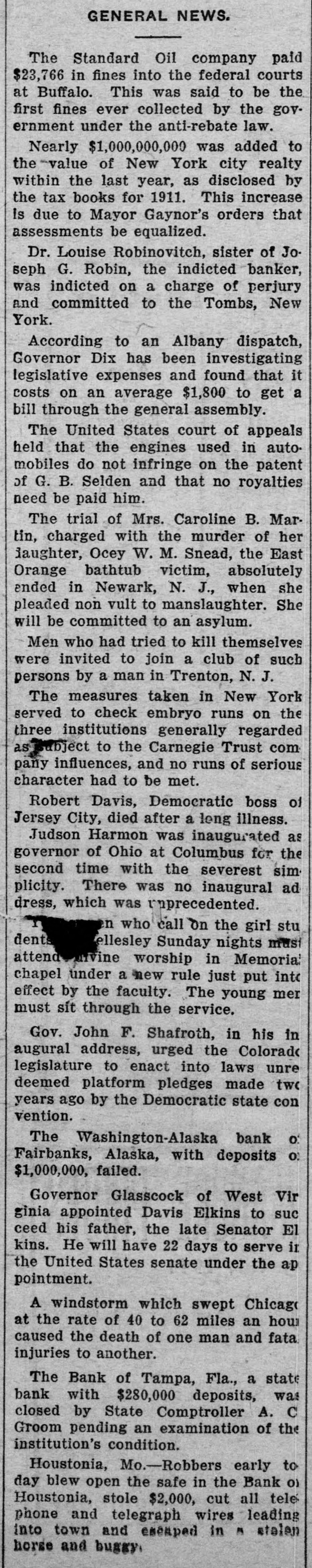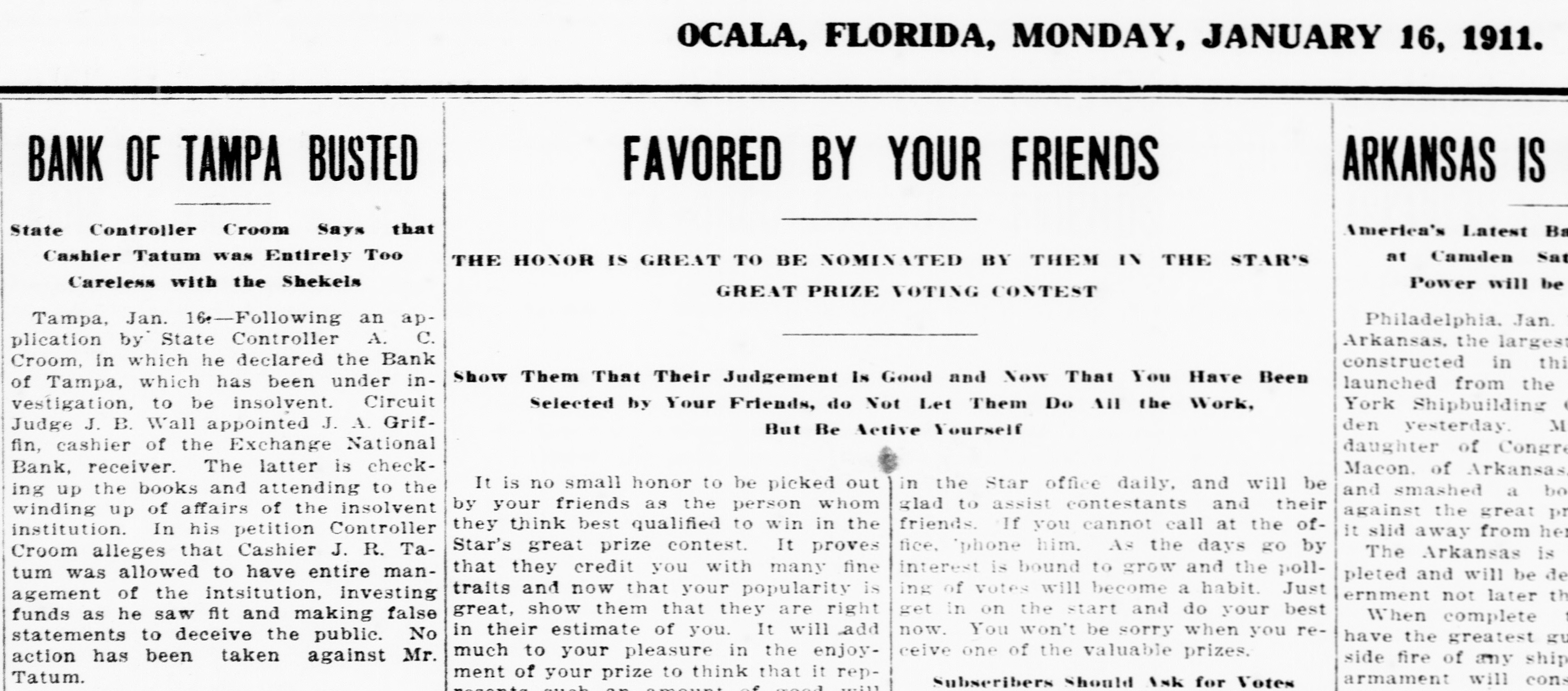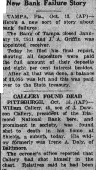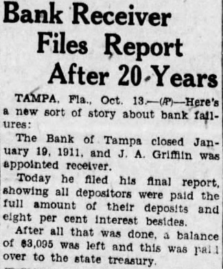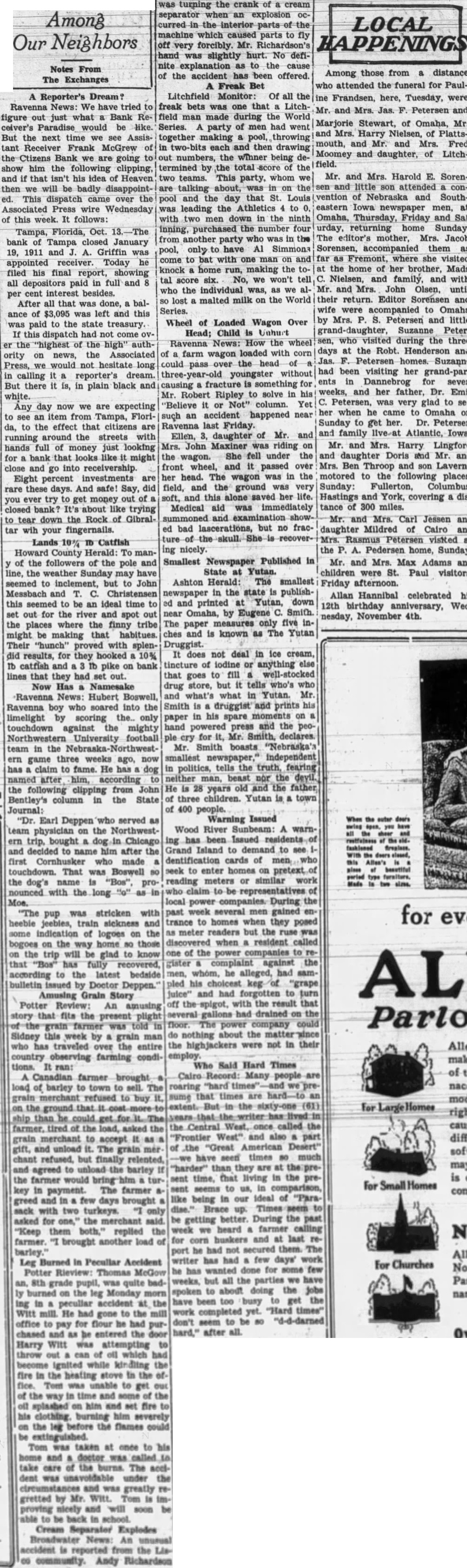 A Reporter's Dream? Ravenna News: We have tried to figure out just what a Bank Receiver's Paradise would be like. But the next time we see Assistant Receiver Frank McGrew of the Ctizens Bank we are going to show him the following clipping, and if that isn't his idea of Heaven then we will be badly disappointed. This dispatch came over the Associated Press wire Wednesday of this week. It follows: Tampa, Florida, Oct. 13.-The bank of Tampa closed January 19, 1911 and J. A. Griffin was appointed receiver. Today he filed his final report, showing all depositors paid in full and 8 per cent interest besides. After all that was done, a balance of $3,095 was left and this was paid to the state treasury. If this dispatch had not come over the "highest of the high" authority on news, the Associated Press, we would not hesitate long in calling it a reporter's dream. But there it is, in plain black and white. Any day now we are expecting to see an item from Tampa, Florida, to the effect that citizens are running around the streets with hands full of money just looking for a bank that looks like it might close and go into receivership. Eight percent investments are rare these days. And safe! Say, did you ever try to get money out of a closed bank? It's about like trying to tear down the Rock of Gibraltar wih your fingernails. Lands 10% TD Catfish Howard County Herald: To many of the followers of the pole and line, the weather Sunday may have seemed to inclement, but to John Messbach and T. C. Christensen this seemed to be an ideal time to set out for the river and spot out the places where the finny tribe might be making that habitues. Their "hunch" proved with splendid results, for they hooked a 10% 1b catfish and a 3 1b pike on bank lines that they had set out. Now Has a Namesake Ravenna News: Hubert Boswell, Ravenna boy who soared into the limelight by scoring the.. only touchdown against the mighty Northwestern University football team in the Nebraska-Northwestern game three weeks ago, now has a claim to fame. He has a dog named after him, according to the following clipping from John Bentley's column in the State Journal: "Dr. Earl Deppen who served as team physician on the Northwestern trip, bought a dog in Chicago and decided to name him after the first Cornhusker who made a touchdown. That was Boswell so the dog's name is "Bos", pronounced with the long "0" as in "The pup was stricken with heeble jeebles, train sickness and some indication of logoes on the bogoes on the way home so those on the trip will be glad to know that "Bos" has fully recovered, according to the latest bedside bulletin issued by Doctor Deppen. Amusing Grain Story Potter Review: An amusing story that fits the present plight of grain farmer was told in Sidney this week by a grain man who has traveled over the entire country observing farming conditions. It ran: A Canadian farmer brought a load of barley to town to sell. The grain merchant refused to buy it, on the ground that It cost more to ship than he could get for it. The farmer. tired of the load, asked the grain merchant to accept It as gift, and unload it. The grain mer chant refused, but finally relented. and agreed to unload the barley If the farmer would bring him a turkey in payment. The farmer a. greed and in a few days brought & sack with two turkeys. only asked for one," the merchant said. "Keep them both," replied the farmer. "I brought another load of barley." Leg Burned in Pecullar Accident Potter Rieview: Thomas McGow an, 8th grade pupil, was quite badly burned on the leg Monday morn Ing in a peculiar accident at the Witt mill. He had gone to the mill office to pay for flour he had purchased and as be entered the door Harry Witt was attempting to throw out a can of oil which had become ignited while kindling the fire in the heating stove in the of fice. Tom was unable to get out of the way in time and some of the oil splashed on him and set fire to his clothing, burning him severely on the leg before the flames could be extinguished. Tom was taken at once to his home and a doctor was called to take care of the burns. The acctdent was unavoidable under the circumstances and was greatly regretted by Mr. Witt. Tom is Improving nicely and will soon be able to be back in school. Cream Separator Explodes Broadwater News: An unusual accident is reported from the Lis00 community. Andy Richardson was turning the crank of a cream separator when an explosion OCcurred in the interior parts of the machine which caused parts to fly off very forcibly. Mr. Richardson's hand was slightly hurt. No definite explanation as to the cause of the accident has been offered. A Freak Bet Litchfield Monitor: Of all the freak bets was one that a Litchfield man made during the World Series. A party of men had went together making a pool, throwing in two-bits each and then drawing out numbers, the winner being determined by the total -score of the two teams. This party, whom we are talking about, was in on the pool and the day that St. Louis was leading the Athletics 4 to 0. with two men down in the ninth inning, purchased the number four from another party who was in the pool, only to have Al Simmons come to bat with one man on and knock a home run, making the total score six. No, we won't tell who the individual was, as we also lost a malted milk on the World Series. Wheel of Loaded Wagon Over Head; Child is Unhurt Ravenna News: How the wheel of a farm wagon loaded with corn could pass over the head of a three-year-old youngster without causing a fracture is something for Mr. Robert Ripley to solve in his "Believe it or Not" column. Yet such an accident happened near Ravenna last Friday. Ellen, 3, daughter of Mr. and Mrs. John Maxiner was riding on the wagon. She fell under the front wheel, and it passed over her head. The wagon was in the field, and the ground was very soft, and this alone saved her life. Medical aid was immediately summoned and examination showed bad lascerations,