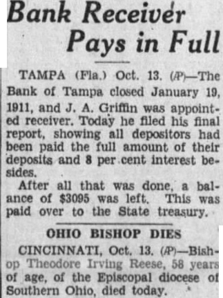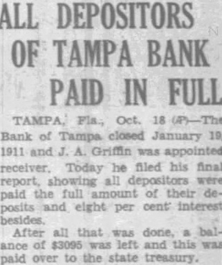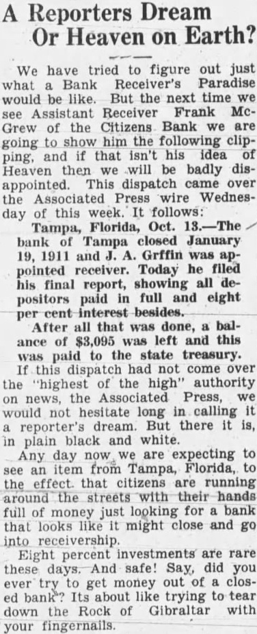 We have tried to figure out just Bank Receiver's Paradise what would be like. But the next time we see Assistant Receiver Frank McGrew of the Citizens Bank we are going show him the following clipping, and that isn't his idea Heaven then will be badly disThis dispatch came over Associated Press wire Wednesday of this week follows: Tampa, Florida, Oct. Tampa closed January 19, and Grffin receiver. Today he filed pointed final report, showing all paid full and eight positors besides. all that done, balance of $3,095 was left and this was paid the state treasury. this dispatch had not come over the "highest of the authority on news, the Associated Press, would not hesitate long in calling reporter's dream. But there plain black and white. Any day are expecting item from Tampa, Florida, the effect that citizens running around streets with their hands full money just looking for bank that looks like might close and receivership. Eight percent investments are rare these days. And safe! Say, you ever to get money out ed bank? Its about trying to tear down Rock of Gibraltar with your fingernails.
