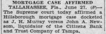 MORTGAGE CASE AFFIRMED TALLAHASSEE, Fla., June The Supreme court today affirmed mortgage case docketed H. Murray versus John Newliquidator of the Citizens Bank and Trust Company of Tampa.