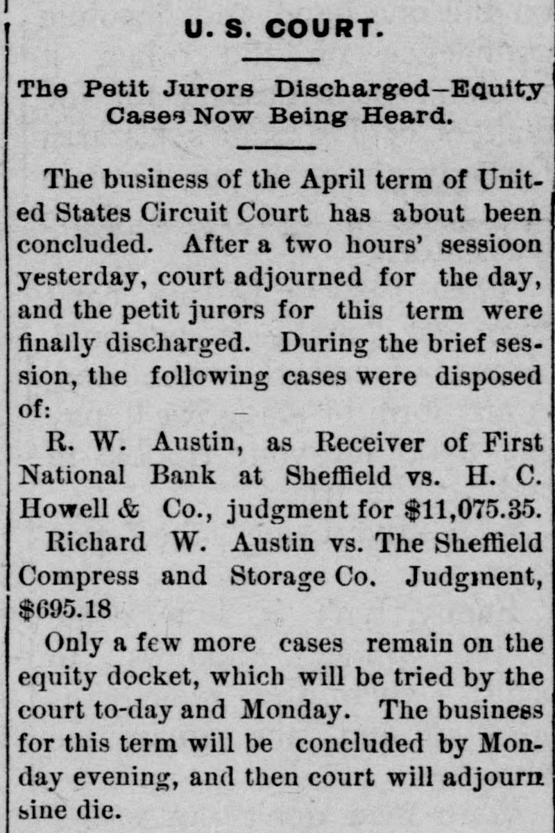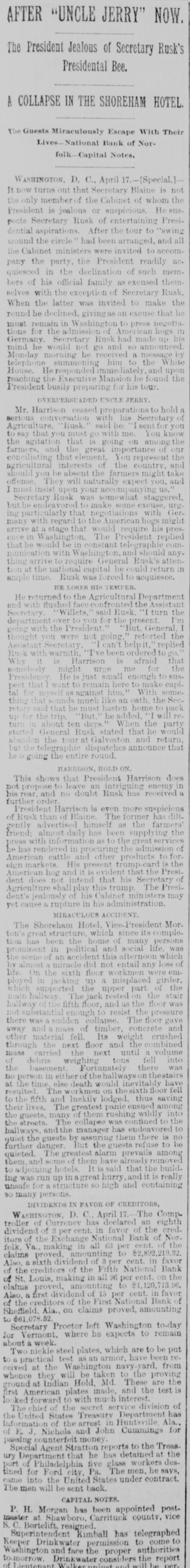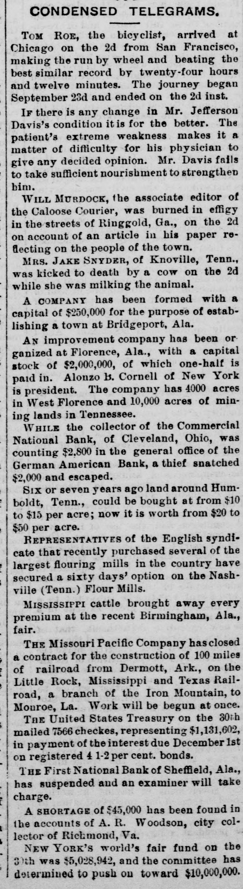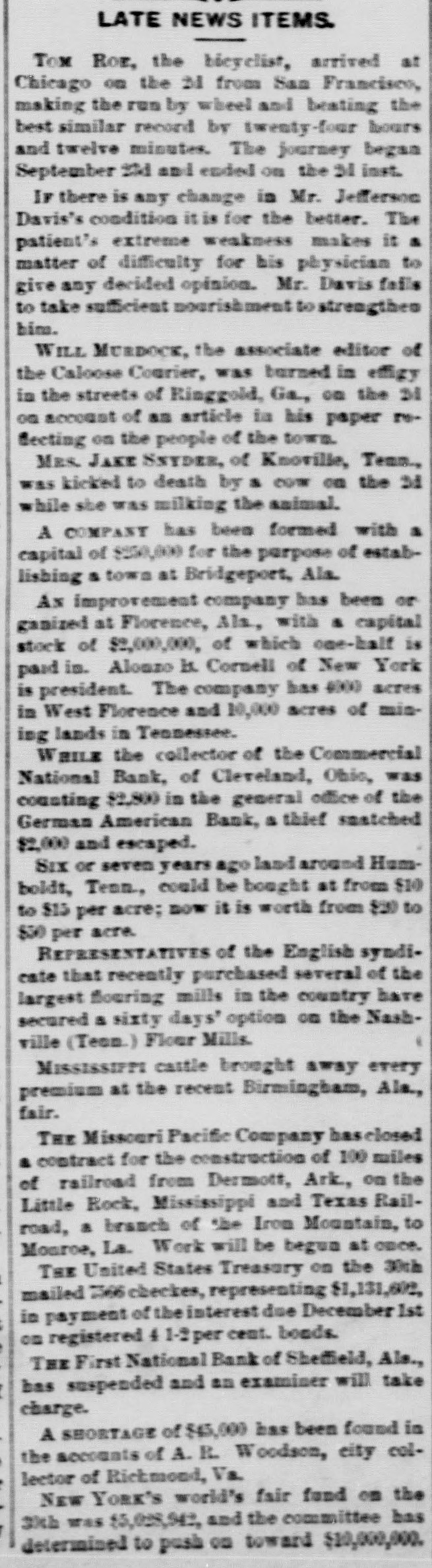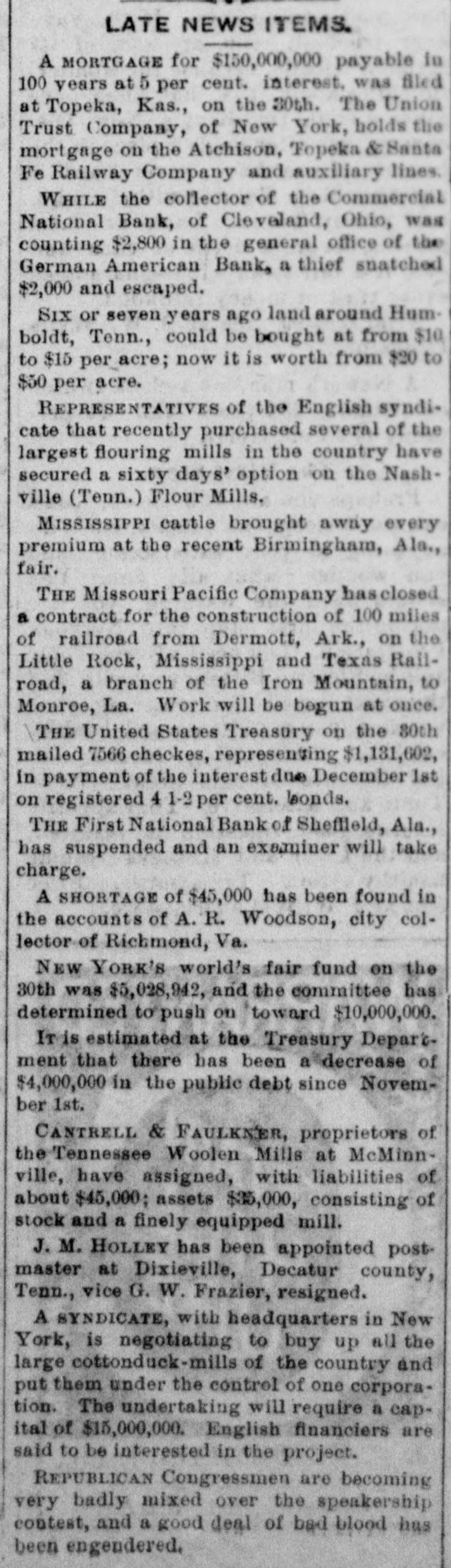 LATE NEWS ITEMS. A MORTGAGE for $150,000,000 payable lu 100 years at 5 per cent. interest. was filed at Topeka, Kas., on the 30th. The Union Trust Company, of New York, holds the mortgage on the Atchison, Topeka & Santa Fe Railway Company and auxiliary lines. WHILE the collector of the Commercial National Bank, of Cleveland, Ohio, was counting $2,800 in the general office of the German American Bank, a thief snatched $2,000 and escaped. Six or seven years ago land around Humboldt, Tenn., could be bought at from $10 to $15 per acre; now it is worth from $20 to $50 per acre. REPRESENTATIVES of the English syndicate that recently purchased several of the largest flouring mills in the country have secured a sixty days' option on the Nashville (Tenn.) Flour Mills. MISSISSIPPI cattle brought away every premium at the recent Birmingham, Ala., fair. THE Missouri Pacific Company has closed a contract for the construction of 100 miles of railroad from Dermott, Ark., on the Little Rock, Mississippi and Texas Railroad, a branch of the Iron Mountain, to Monroe, La. Work will be begun at once. THE United States Treasury on the 80th mailed 7566 checkes, representing $1,131,602, in payment of the interest due December 1st on registered 4 1-2 per cent. bonds. THE First National Bank of Sheffield, Ala., has suspended and an examiner will take charge. A SHORTAGE of $45,000 has been found in the accounts of A. R. Woodson, city collector of Richmond, Va. NEW YORK'S world's fair fund on the 30th was $5,028,942, and the committee has determined to push on toward $10,000,000. Ir is estimated at the Treasury Department that there has been a decrease of $4,000,000 in the public debt since November 1st. CANTRELL & FAULKNER, proprietors of the Tennessee Woolen Mills at McMinnville, have assigned, with liabilities of about $45,000; assets $35,000, consisting of stock and a finely equipped mill. J. M. HOLLEY has been appointed postmaster at Dixieville, Decatur county, Tenn., vice G. W. Frazier, resigned. A SYNDICATE, with headquarters in New York, is negotiating to buy up all the large cottonduck-mills of the country and put them under the control of one corporation. The undertaking will require a capital of $15,000,000. English financiers are said to be interested in the project. REPUBLICAN Congressmen are becoming very badly mixed over the speakership contest, and a good deal of bad blood has been engendered.