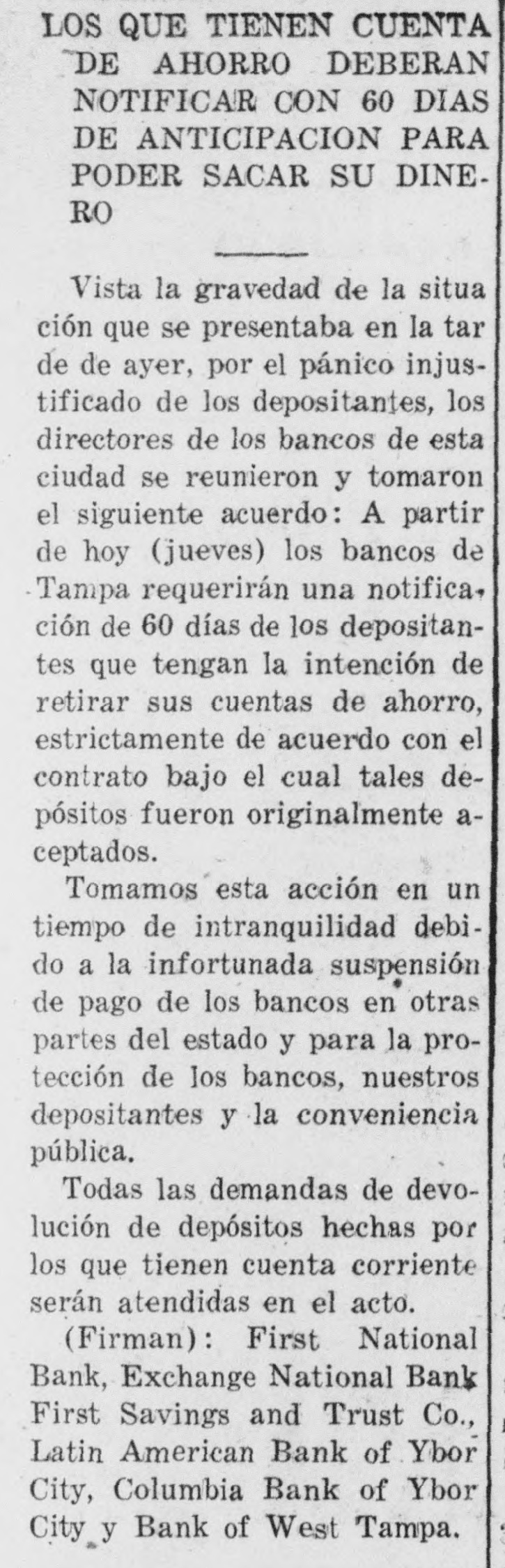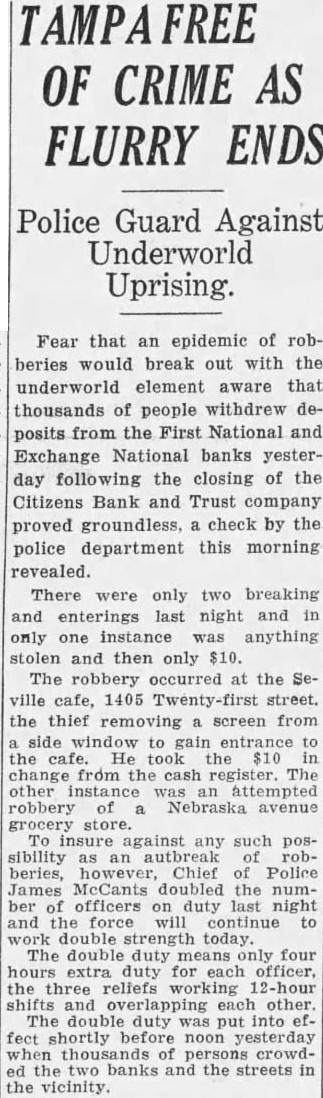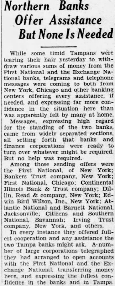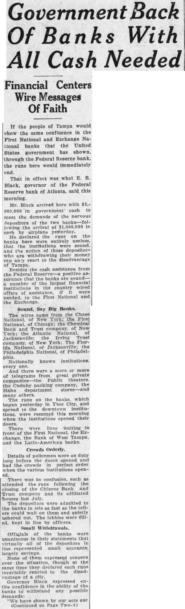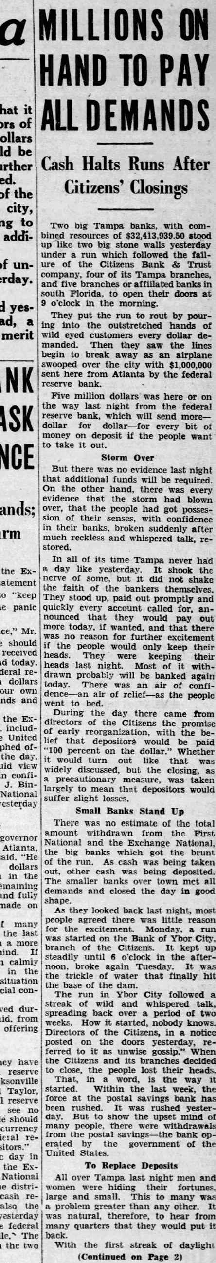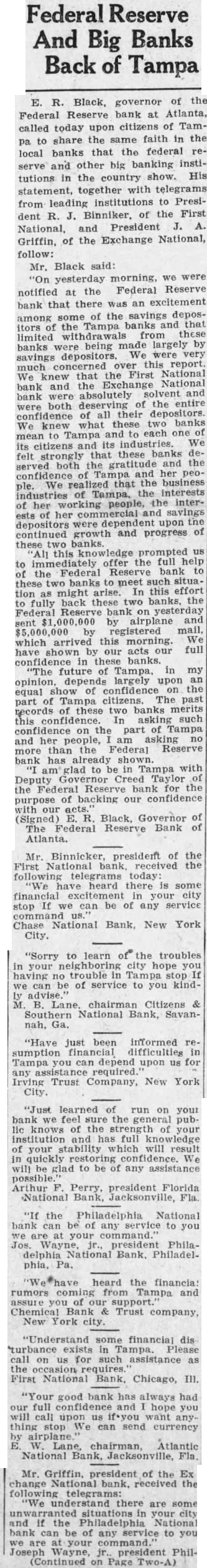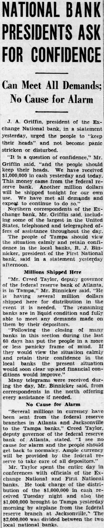 NATIONAL BANK PRESIDENTS ASK FOR CONFIDENCE Can Meet All Demands; No Cause for Alarm Griffin, president of the Exchange National bank, in statement yesterday, urged the people to their heads" and become panic stricken disturbed. question of confidence," Mr. Griffin said, "and the people should keep their heads. have received cash yesterday and today. This money from federal bank. Another dollars will shipped tonight for We have all demands expect continue Northern correspondents the Exchange Mr Griffin said, including some the largest the United States, telephoned and telegraphed offers assistance throughout the The people Tampa should view the situation calmly retain confidence local banks, Binnicker, president the First National in statement yesterday afternoon. Millions Shipped Here Creed Taylor, deputy governor the federal Atlanta, Tampa,' Binnicker having million dollars shipped for distribution in the event needed. The remaining banks liquid condition and fully able meet demands made on their depositors. "Following closing of banks this during the days the people panicky frame mind. they would view the situation calmly retain their confidence in the local banks present situation would clear financial conditions would improve." Many telegrams received during the day, Mr. Binnicker said, from correspondents in north offering every assistance needed. No Cause for Alarm "Several millions currency have federal reserve branches and Jacksonville Tampa Creed Taylor, deputy governor the federal reserve bank for alarm the people should back Ample currency be provided the federal of all depositors.' Mr. spent the entire day conferences officials of the change National First National banks. He took charge of the distribution the cash ceived Tuesday night also brought Tampa yesterday morning by airplane from the federal reserve branch The divided between the local national banks.