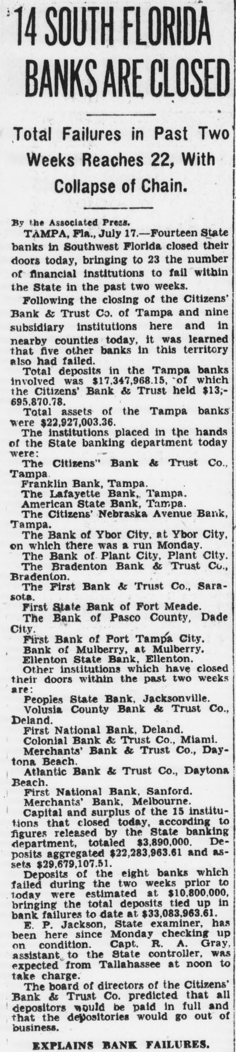 14 SOUTH FLORIDA BANKS ARE CLOSED Total Failures in Past Two Weeks Reaches 22, With Collapse of Chain. By the Associated Press. TAMPA, Fla., July 17.-Fourteen State banks in Southwest Florida closed their doors today, bringing to 23 the number of financial institutions to fail within the State in the past two weeks. Following the closing of the Citizens' Bank & Trust Co. of Tampa and nine subsidiary institutions here and in nearby counties today, it was learned that five other banks in this territory also had failed. Total deposits in the Tampa banks involved was $17,347,968.15, of which the Citizens' Bank & Trust held $13;695.870.78. Total assets of the Tampa banks were $22,927,003.36. The institutions placed in the hands of the State banking department today were: The Citizens" Bank & Trust Co., Tampa Franklin Bank, Tampa. The Lafayette Bank, Tampa. American State Bank, Tampa. The Citizens' Nebraska Avenue Bank, Tampa. The Bank of Ybor City, at Ybor City, on which there was a run Monday. The Bank of Plant City, Plant City. The Bradenton Bank & Trust Co., Bradenton. The First Bank & Trust Co., Sarasota. First State Bank of Fort Meade. The Bank of Pasco County, Dade City. First Bank of Port Tampa City. Bank of Mulberry, at Mulberry. Ellenton State Bank, Ellenton. Other institutions which have closed their doors within the past two weeks are: Peoples State Bank, Jacksonville. Volusia County Bank & Trust Co., Deland. First National Bank, Deland. Colonial Bank & Trust Co., Miami. Merchants' Bank & Trust Co., Daytona Beach. Atlantic Bank & Trust Co., Daytona Beach. First National Bank, Sanford. Merchants' Bank, Melbourne. Capital and surplus of the 15 institutions that closed today, according to figures released by the State banking department, totaled $3,890,000. Deposits aggregated $22,283,963.61 and assets $29,679,107.51. Deposits of the eight banks which failed during the two weeks prior to today were estimated at $10,800,000, bringing the total deposits tied up in bank failures to date at $33,083,963.61. E. P. Jackson, State examiner, has been here since Monday checking up on condition. Capt. R. A. Gray, assistant to the State controller, was expected from Tallahassee at noon to take charge. The board of directors of the Citizens' Bank & Trust Co. predicted that all depositors would be paid in full and that the depositories would go out of business. EXPLAINS BANK FAILURES.