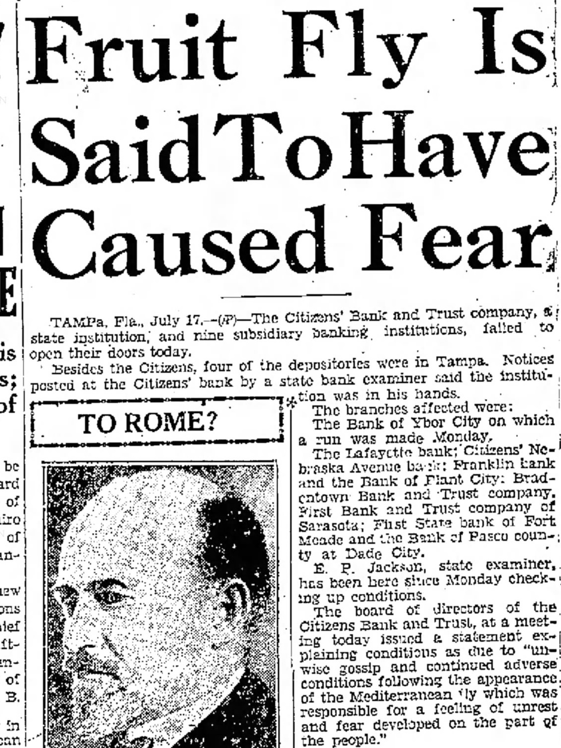 Is Fruit Fly Caused Bank and Trust company, Citizens' TAMPa. July institutions, to subsidiary banking state institution, and nine their doors today. open in Tampa. Notices of the depositories were Besides the Citizens, four said the institubank examiner Citizens' bank by state posted nt the was in his hands. affected were: The TO ROME? The Bank of Ybor City on which was made bank: Citizens' The Franklin braska Avenue the Bank of Flant City: Bradentown Bank and Trust company. First Bank and Trust company State bank of Fort Meade and Bank of Pasco coun-: Dade City. Jackson, state examiner, has been here since Monday checkup conditions. ing directors of the The board Citizens Bank and Trust, meetissued statement today conditions due to and continued adverse gossip following the appearance conditions Mediterranean which was the feeling of unrest responsible for on the part of and fear developed the people.'