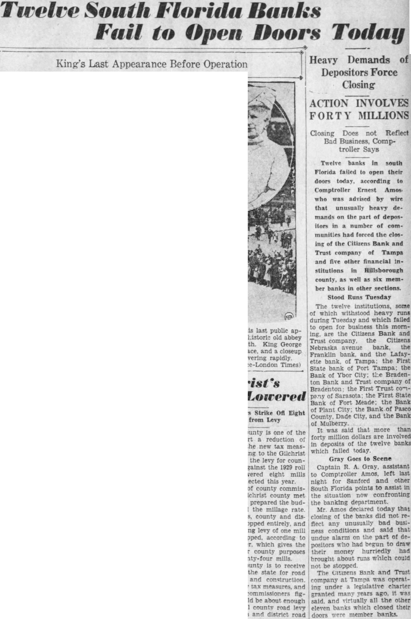 Twelve South Florida Banks Fail to Open Doors Today King's Last Appearance Before Operation Demands of Heavy Depositors Force Closing ACTION INVOLVES FORTY MILLIONS Closing Does not Reflect Bad Business, Comptroller Says Twelve banks in south Florida failed to open their doors today, according to Comptroller Ernest Amos. who was advised by wire that unusually heavy demands on the part of depositors in number of communities had forced the closing of the Citizens Bank and Trust company of Tampa and five other financial institutions in Hillsborough county, as well as six member banks in other sections. Stood Runs Tuesday The twelve institutions, some of which withstood heavy runs during Tuesday and which failed to open for business this morning, are the Citizens Bank and Trust company, the Citizens Nebraska avenue bank, the Franklin bank. and the Lafayette bank, of Tampa; the First State bank of Port Tampa; the Bank of Ybor City: the BradenBank and Trust company of Bradenton: the First Trust pany of Sarasota: the First State Bank of Fort Meade: the Bank of Plant City: the Bank of Pasco County, Dade City, and the Bank of Mulberry. It was said that more than forty million dollars are involved in deposits of the twelve banks which failed today. Gray Goes to Scene Captain R. Gray, assistant to Comptroller Amos, left last night for Sanford and other South Florida points to assist in the situation now confronting the banking department Mr. Amos declared today that closing of the banks did not flect any unusually bad business conditions and said that undue alarm on the part of depositors who had begun to draw their money hurriedly had brought about runs which could not be stopped. The Citizens Bank and Trust company at Tampa was operatunder legislative charter granted many years ago, said. and virtually all the other eleven banks which closed their were member banks. doors