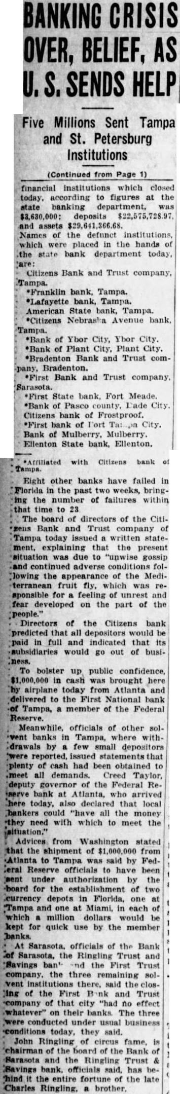 BANKING CRISIS OVER, BELIEF, AS SENDS HELP Five Millions Sent Tampa and St. Petersburg Institutions (Continued from Page financial institutions which closed today, according figures at the banking department, was $3,630,000; deposits $22,575,728.97 and Names of the defunct institutions, which the hands state bank department today, Citizens Bank and Trust company, Tampa. *Franklin bank, Tampa. Lafayette bank, Tampa. American State Tampa. *Citizens Nebraska Avenue bank, Tampa. *Bank of Ybor City, Ybor City. *Bank Plant City, Plant City. *Bradenton Bank and Trust Bradenton. *First Bank and Trust company Sarasota. *First State bank, Fort Meade. *Bank Citizens bank of Frostproof. bank Tort City. Bank Mulberry. Mulberry. Ellenton State bank, Ellenton. with Citizens Eight other banks have failed the past weeks, bringthe number of failures within time board directors of the CitiBank Trust company of Tampa today issued written stateexplaining that the present situation due to "unwise gossip continued adverse fol"lowing the appearance of the Mediterranean fruit fly. was sponsible for feeling unrest and fear developed on the part of the Directors of the Citizens bank predicted that all depositors would be full and indicated that its subsidiaries would go out of busibolster up public confidence, $1,000,000 cash was brought here airplane today from Atlanta and delivered the First National bank Tampa, member the Federal Reserve. Meanwhile, officials of other solbanks Tampa, where withdrawals by few depositors reported, issued statements plenty of been obtained demands. Creed governor the Federal Rebank Atlanta, arrived today, also declared that local bankers could all the money need with which meet the from Washington stated the shipment of from Tampa said by FedReserve officials to have been authorization by the for the establishment of two depots one in each million dollars would quick use by the member officials of the Bank Sarasota, the Ringling Trust and First Trust company. the three solinstitutions there, said of the First and Trust "company that city no effect their banks. The three under usual business today, they said. Ringling circus fame, the board the Bank Sarasota and the Ringling Trust Savings bank. officials has the entire fortune the late Charles Ringling. brother.