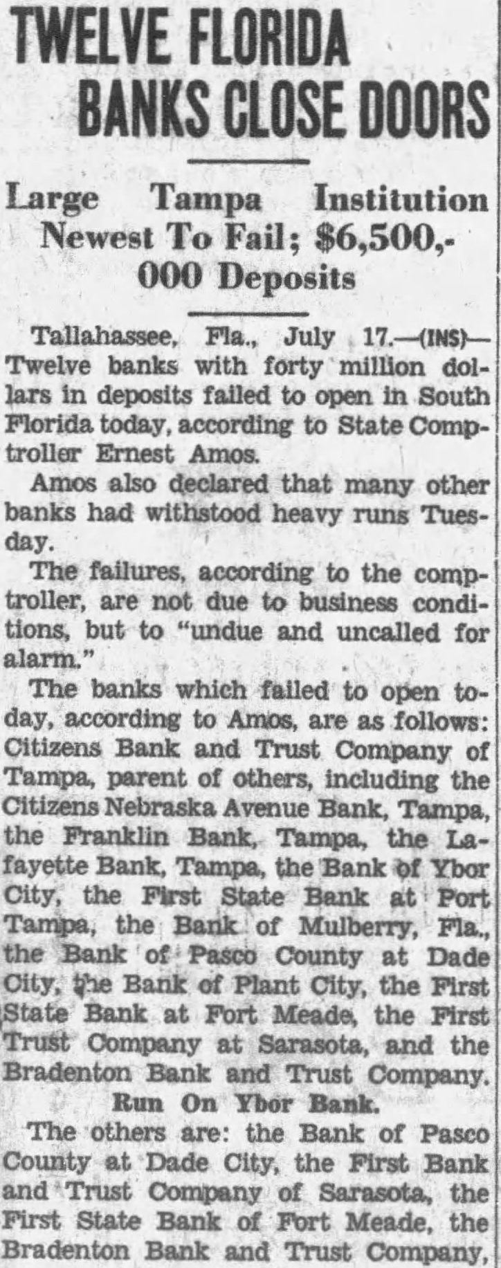 TWELVE FLORIDA BANKS CLOSE DOORS Large Tampa Institution Newest To Fail; $6,500,000 Deposits Tallahassee, Fla., July 17.-(INS)Twelve banks with forty million dollars in deposits failed to open in South Florida today, according to State Comptroller Ernest Amos. Amos also declared that many other banks had withstood heavy runs Tuesday. The failures, according to the comptroller, are not due to business conditions, but to "undue and uncalled for alarm.' The banks which failed to open today, according to Amos, are as follows: Citizens Bank and Trust Company of Tampa, parent of others, including the Citizens Nebraska Avenue Bank, Tampa, the Franklin Bank, Tampa, the Lafayette Bank, Tampa, the Bank of Ybor City, the First State Bank at Port Tampa, the Bank of Mulberry, Fla., the Bank of Pasco County at Dade City, the Bank of Plant City, the First State Bank at Fort Meade, the First Trust Company at Sarasota, and the Bradenton Bank and Trust Company. Run On Ybor Bank. The others are: the Bank of Pasco County at Dade City, the First Bank and Trust Company of Sarasota, the First State Bank of Fort Meade, the Bradenton Bank and Trust Company,