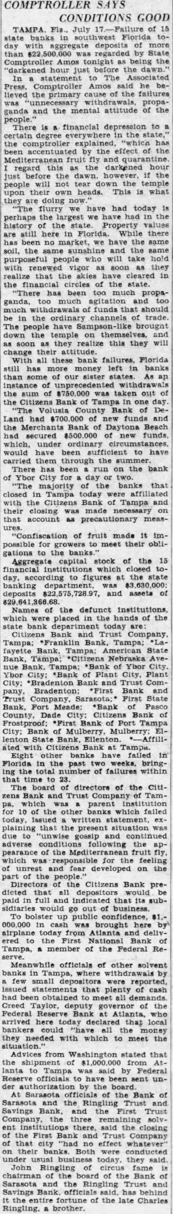 COMPTROLLER SAYS CONDITIONS GOOD TAMPA July of today aggregate deposits more than regarded State Amos tonight being the 'darkened hour just the dawn. In statement The Comptroller he bethe primary cause of the was ganda and the mental attitude of the people. There financial depression to degree the the comptroller explained, "which has accentuated by the effect of the regard this the just however, people will not tear the temple upon their heads. This what they are doing "The flurry we have had today perhaps the largest we have the history of the Property values in Florida. While there been no we the same the and same who will take hold they that cleared in the circles of the state. "There has been too much propaganda, much agitation and funds that should be in the ordinary channels of trade. The people have brought down temple on themselves, as they this they will change With all bank failures. Florida still has money banks than our sister As an instance the sum $750,000 was taken out the Citizens Bank Tampa one day. "The Volusia County Bank DeLand had of new funds and the Bank of Daytona Beach had secured $500,000 new funds, which, ordinary would to have carried the There on the bank of for "The majority of banks that closed in Tampa today affiliated the Citizens Bank of Tampa and their closing was made that account as precautionary meas"Confiscation of fruit made it impossible for to their gations to the Aggregate capital stock of the 15 which today. to figures the state banking department, deposits and assets of Names of the defunct institutions which were placed in hands of the bank today Bank and Trust Tampa: *Franklin Tampa; *Lafayette Bank, Tampa: American State Bank Tampa; Nebraska Bank, Tampa: *Bank Ybor City, City: *Bank of Plant City, Plant *Bradenton and Trust ComBradenton: *First Bank and Trust Company, First State Bank, *Bank Pasco County, City: Bank Frostproof; Bank Port Tampa Bank lenton Bank, Ellenton. ated Citizens Bank at Tampa. Eight banks in weeks, bringing failures within board directors of the Citizens Bank Trust which parent institution the other banks which failed today, issued written statement, the present "unwise and the pearance the which was responsible for the feeling unrest fear on the the Directors the Citizens Bank predicted depositors indicated go out of business confidence, cash brought here airplane today from Atlanta and delivFirst National Bank Tampa, member of the Federal Reofficials of other solvent in statements plenty cash had been Creed Taylor, deputy governor of Federal Reserve Bank Atlanta, arrived here today declared that local the money they with which to meet from Washington stated that the from lanta Tampa said by Federal Reserve officials to have been sent under authorization by the board At Sarasota officials of the Bank of Sarasota and the Savings and the First Trust Company, the three solvent there, said closing the First Bank and Trust Company that city "had no effect whatever" their Both were conducted under usual today. they said John Ringling circus fame chairman of the Bank Sarasota the and Savings has behind fortune of the late Charles brother.