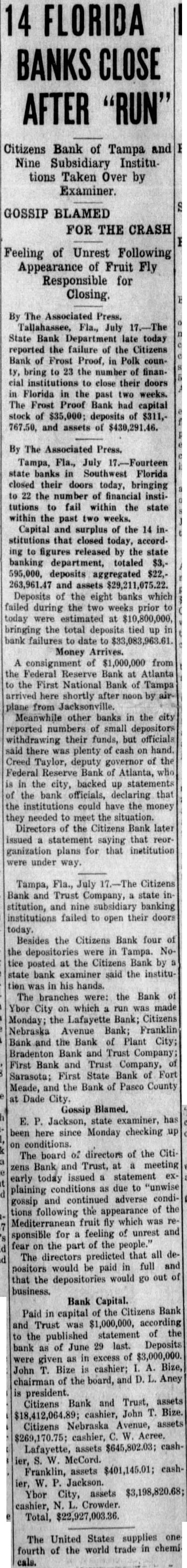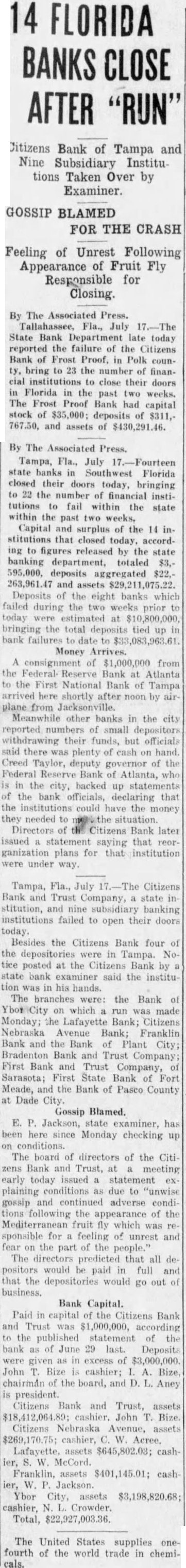 FLORIDA BANKS AFTER "RUN" Citizens Bank of Tampa and Nine Subsidiary Institutions Taken Over by Examiner. GOSSIP BLAMED FOR THE CRASH Feeling of Unrest Following Appearance of Fruit Fly Responsible for Closing. By The Associated Press. Tallahassee, Fla., July State Bank Department late today reported the failure of the Citizens Bank of Frost Proof, in Polk counbring to 23 the number of financial institutions to close their doors Florida in the past two weeks. The Frost Proof Bank had capital stock of $35,000; deposits of $311,and assets of By The Associated Press. Tampa, Fla., July 17.-Fourteen state banks in Southwest Florida closed their doors today, bringing to 22 the number of financial institutions to fail within the state within the past two weeks. Capital and surplus of the stitutions that closed today, according to figures released by the state banking department, totaled $3,595,000, deposits aggregated $22,263,961.47 and assets $29,211,075.22. Deposits of the eight banks which failed during the two weeks prior today were estimated at bringing the total deposits tied bank failures to date to Money Arrives. A consignment of $1,000,000 from the Federal Reserve Bank at Atlanta to the First National Bank of Tampa arrived here shortly noon plane from Jacksonville. Meanwhile other banks in the city reported numbers of small depositors withdrawing their funds, but officials said there was plenty of cash on hand. Creed Taylor, deputy governor of the Federal Reserve Bank of Atlanta, who in the city, backed up statements of the bank officials, declaring that the institutions could have the money needed to meet the situation. Directors of the Citizens Bank later issued statement saying that reorganization plans for that institution under way. Tampa, Fla., July Citizens Bank and Trust Company, state institution, nine subsidiary banking institutions failed to open their doors today. Besides the Citizens Bank four the depositories were in Tampa. Notice posted at the Citizens Bank by state bank examiner said the institution in his hands. The branches were: the Bank Ybor City on which run was made the Lafayette Bank; Citizens Monday; Nebraska Avenue Bank; Franklin Bank and the Bank of Plant City; Bradenton Bank and Trust Company; First Bank and Trust Company, First State Bank of Fort Sarasota; Meade, and the Bank of Pasco County Dade Gossip Blamed. Jackson, state examiner, has been here since Monday checking up conditions. The board of directors of the Citiand at meeting zens Bank early today issued statement conditions as due to "unwise plaining gossip and continued adverse conditions following the appearance of the Mediterranean fruit fly which sponsible for feeling of unrest and fear on the part of the people." that all deThe directors predicted positors would be paid in full and that the depositories would go out of business. Bank Capital. Paid in capital of the Citizens Bank Trust $1,000,000, according and was to the published statement of the of June 29 last. Deposits bank as in excess of $3,000,000. were given as cashier; Bize, John Bize is of the board, and Aney chairman president. Bank and Trust, assets Citizens John Bize. $18,412,064.89; cashier, Avenue, assets Citizens Nebraska cashier, $645,802.03; cashLafayette, assets McCord. ier, Franklin, assets ier, W. Jackson. Ybor City, assets cashier, Crowder. Total, The United States supplies onethe world trade in chemifourth of cals.