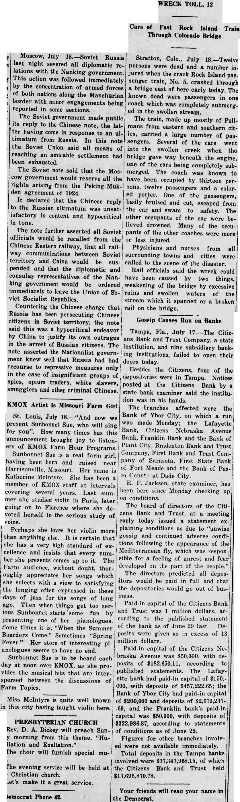 WRECK TOLL, 12 Moscow, July 18.-Soviet Russia last night severed all diplomatic relations with the Nanking government. This action was followed immediately by the concentration of armed forces of both nations along the Manchurian border with minor engagements being reported in some sections. The Soviet government made public its reply to the Chinese note, the latter having come in response to an ultimatum from Russia. In this note the Soviet Union said all means of reaching an amicable settlement had been exhausted. The Soviet note said that the Moscow government would reserve all the rights arising from the Peking-Mukden agreement of 1924. It declared that the Chinese reply to the Russian ultimatum was unsatisfactory in content and hypocritical in tone. The note further asserted all Soviet officials would be recalled from the Chinese Eastern railway, that all railway communications between Soviet territory and China would be suspended and that the diplomatic and consular representatives of the Nanking government would be ordered immediately to leave the Union of Soviet Socialist Republics. Countering the Chinese charge that Russia has been persecuting Chinese citizens in Soviet territory, the note said this was a hypocritical endeavor by China to justify its own outrages in the arrest of Russian citizens. The note asserted the Nationalist government knew well that Russia had had recourse to repressive measures only in the case of insignificant groups of spies, opium traders, white slavers, smugglers and other criminal Chinese. KMOX Artist Is Missouri Farm Girl St. Louis, July 18.-"And now we present Sunbonnet Sue, who will sing for you". How many times has this announcement brought joy to listeners of KMOX Farm Hour Programs. Sunbonnet Sue is a real farm girl, having been born and raised near Harrisonville, Missouri. Her name is Katherine McIntyre. She has been a member of KMOX staff at intervals covering several years. Last summer she studied violin in Paris, later going on to Florence where she devoted herself to the serious study of voice. Perhaps she loves her violin more than anything else. It is certain that she has a very high standard of excellence and insists that every number she presents comes up to it. The Farm audience, without doubt, thoroughly appreciates her songs which she selects with a view to satisfying the longing often expressed in these days of jazz for the songs of long ago. Then when things get too serious Sunbonnet starts some fun by presenting one of her pianologues. Some times it is, "When the Summer Boarders Come." Sometimes "Spring Fever." Her store of interesting pianologues seems to have no end. Sunbonnet Sue is to be heard each day at noon over KMOX, as she provides the musical bits that are interspersed between the discussions of Farm Topics. Cars of Fast Rock Island Train Through Colorado Bridge Miss McIntyre is quite well known in this city having taught violin here. Stratton, Colo., July 18.-Twelve persons were dead and a number injured when the crack Rock Island passenger train, No. 5, crashed through a bridge east of here early today. The known dead were passengers in one coach which was completely submerged in the swollen stream. The train, made up mostly of Pullmans from eastern and southern cities, carried a large number of passengers. Several of the cars went into the swollen creek when the bridge gave way beneath the engine, one of the cars being completely submerged. The coach was known to have been occupied by thirteen persons, twelve passengers and a colored porter. One of the passengers, badly bruised and cut, escaped from the car and swam to safety. The other occupants of the car were believed drowned. Many of the occupants of the other coaches were more or less injured. Physicians and nurses from all surrounding towns and cities were called to the scene of the disaster. Rail officials said the wreck could have been caused by two things, weakening of the bridge by excessive rains and swollen waters of the stream which it spanned or a broken rail on the bridge. Gossip Causes Run on Banks Tampa, Fla., July 17.-The Citizens Bank and Trust Company, a state institution, and nine subsidiary banking institutions, failed to open their doors today. Besides the Citizens, four of the depositories were in Tampa. Notices posted at the Citizens Bank by state bank examiner said the institution was in his hands. The branches affected were the Bank of Ybor City, on which a run was made Monday; the Lafayette Bank, Citizens Nebraska Avenue Bank, Franklin Bank and the Bank of Plant City, Bradenton Bank and Trust Company, First Bank and Trust Company of Sarasota, First State Bank of Fort Meade and the Bank of Pasco County at Dade City. E. P. Jackson, state examiner, has been here since Monday checking up on conditions. The board of directors of the Citizens Bank and Trust, at a meeting early today issued a statement explaining conditions as due to "unwise gossip and continued adverse conditions following the appearance of the Mediterranean fly, which was responsible for a feeling of unrest and fear developed on the part of the people." The directors predicted all depositors would be paid in full and that the depositories would go out of business. Paid-in capital of the Citizens Bank and Trust was 1 million dollars, according to the published statement of the bank as of June 29 last. Deposits were given as in excess of 13 million dollars. Paid-in capital of the Citizens Nebraska Avenue was $50,000, with deposits of $182,650.11, according to published statements. The Lafayette bank had paid-in capital of $150, 000, with deposits of $457,222.65; the Bank of Ybor City had paid-in capital of $200,000 and deposits of $2,679,237.69, and the Franklin bank's paid-in capital was $50,000, with deposits of $322,986.87, according to statements of conditions as of June 29. Figures for other branches involved were not available immediately. Total deposits in the Tampa banks